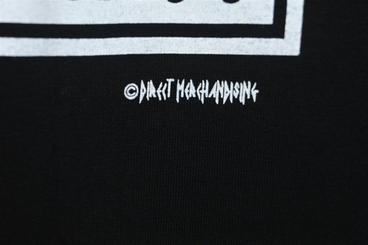 This cool double-sided band tee is for the groove metal band Grip Inc. The back of this tee features a large graphic mocking the parental advisory label developed by the RIAA, and it warns of "explicit f*cking lyrics".