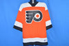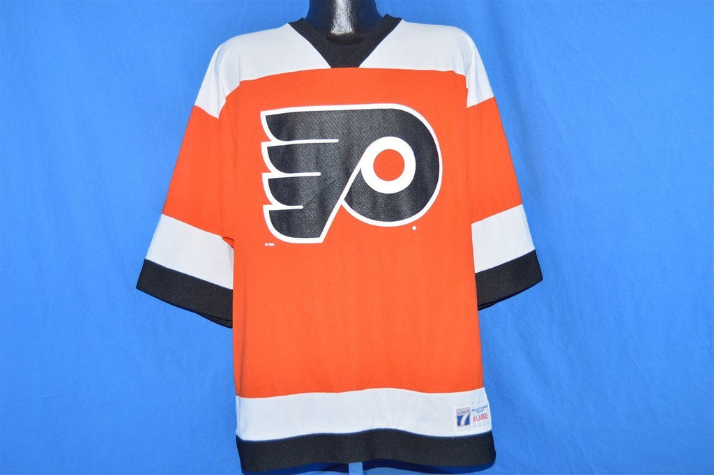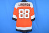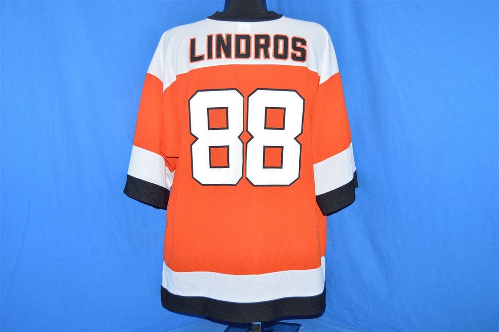 This orange and white vintage hockey jersey is for the Philadelphia Flyers NHL team. The jersey has the number and name of Eric Lindros, a former Flyers team captain and center. Lindros was a part of the "Legion of Doom" along with John LeClair and Mikael Renberg.