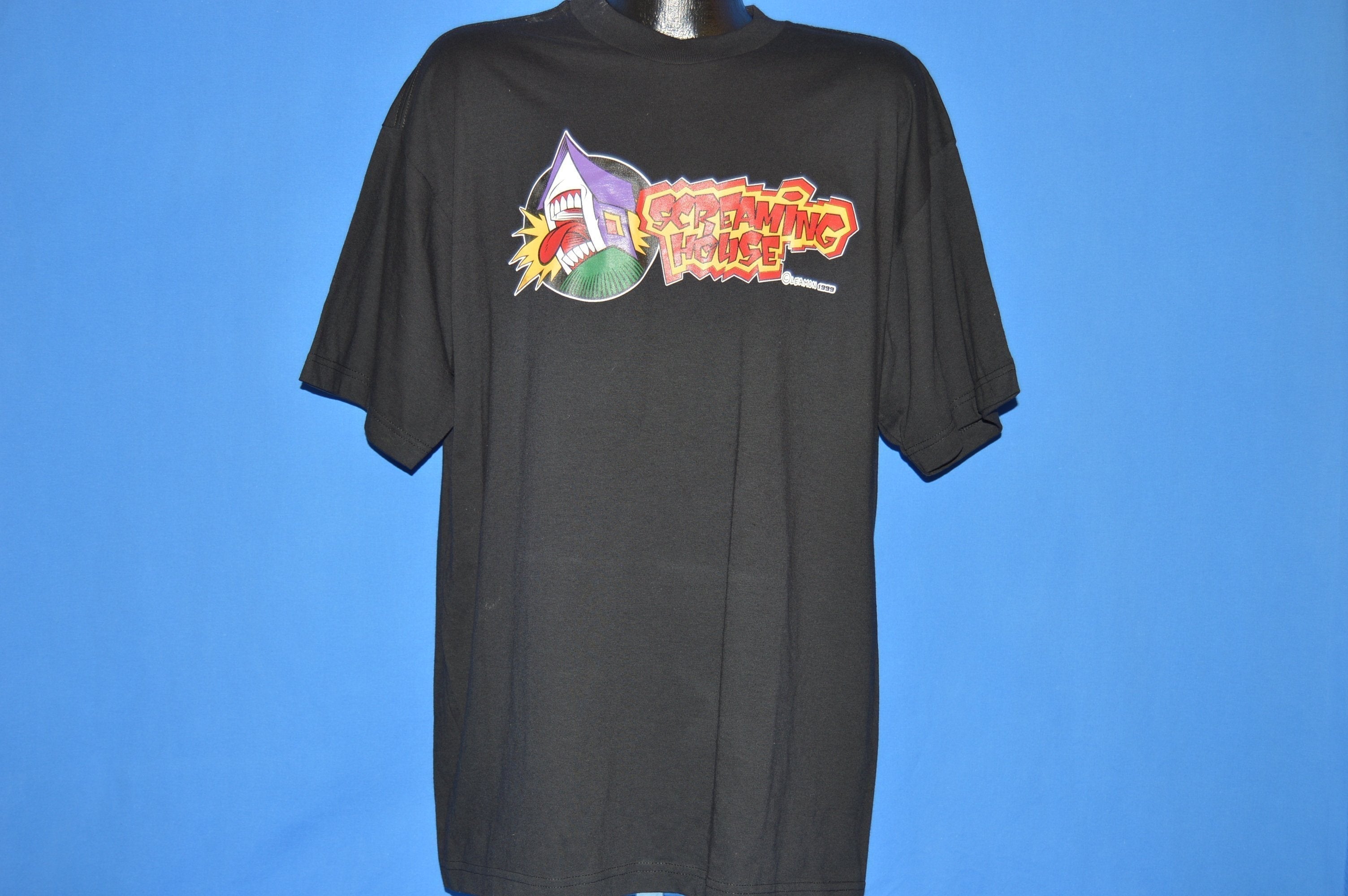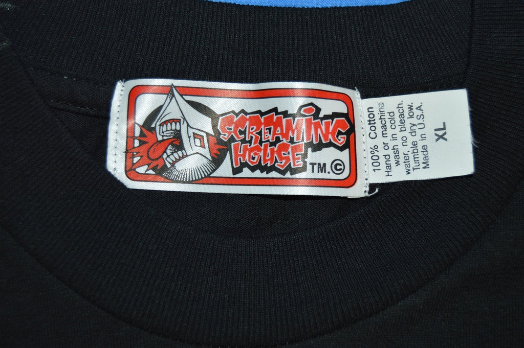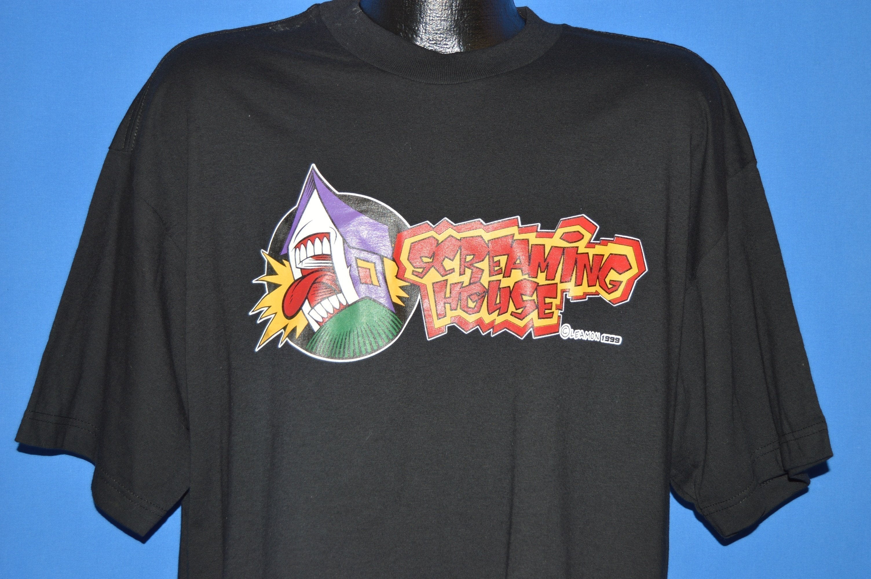 This dope t-shirt is for skateboard company Screaming House Skateboards and was designed by the artist Dave Leamon. It has an image of their logo on the front of the shirt. Leamon is a California based artist whose work has appeared on everything from advertisements to skatedecks to t-shirts. His colorful lowbrow art style has been showcased on a number of album covers and gig posters for groups like the Kottonmouth Kings, Three Bad Jacks, Electric Frankenstein, Jimmy Eat World, Dick Dale, The Boozehounds, and Frantic Flintstones.
