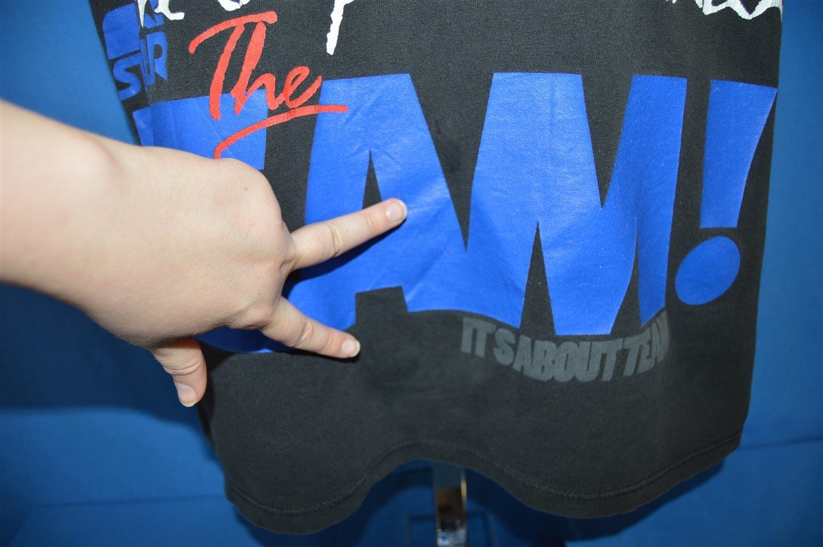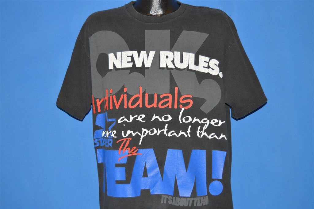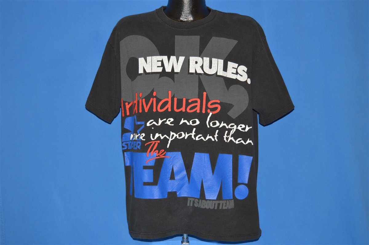This t-shirt is from the athletic clothing brand Starter. The shirt features the text "O.K, New Rules. Individuals are no longer more important than the team! It's about the team". The shirt also features the Starter logo printed on the front and a Starter label on one of the sleeves.