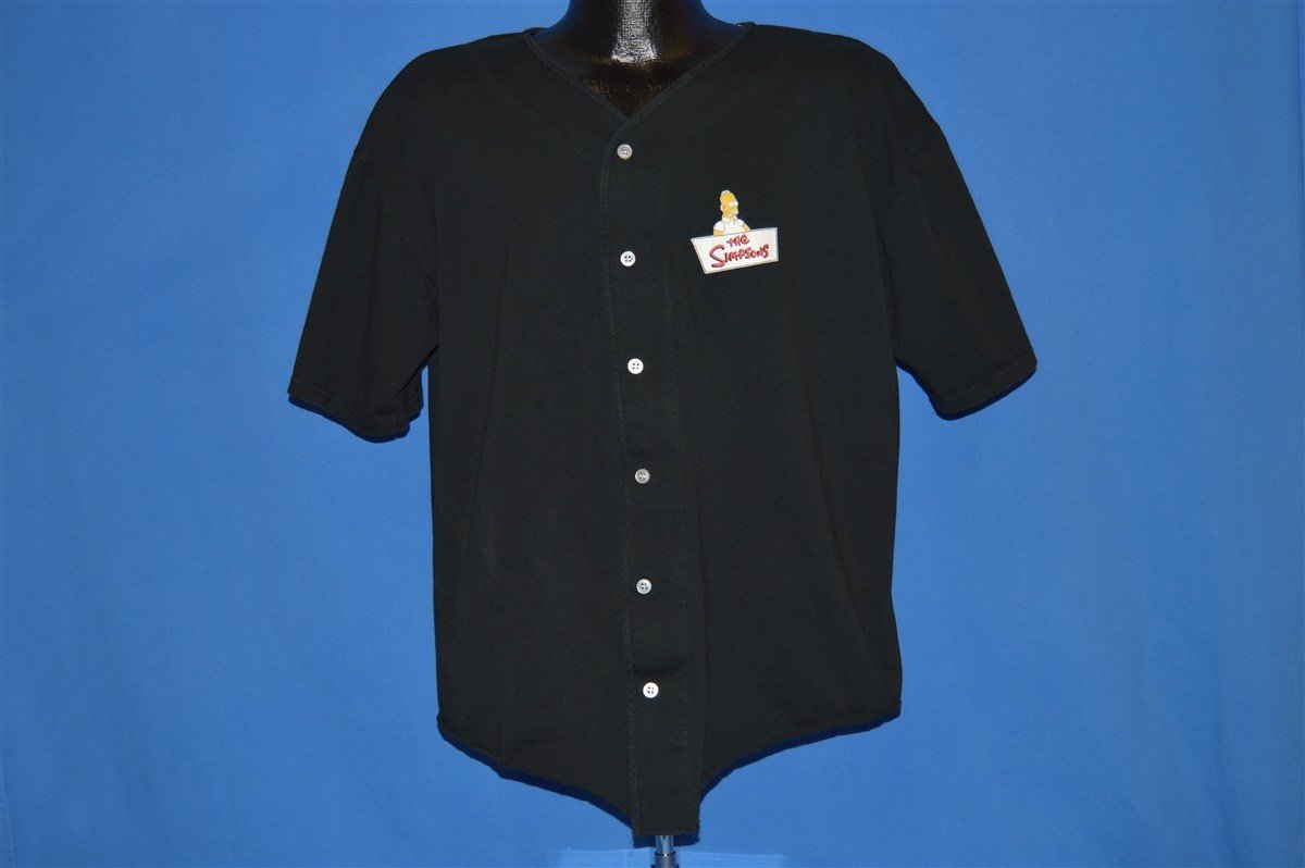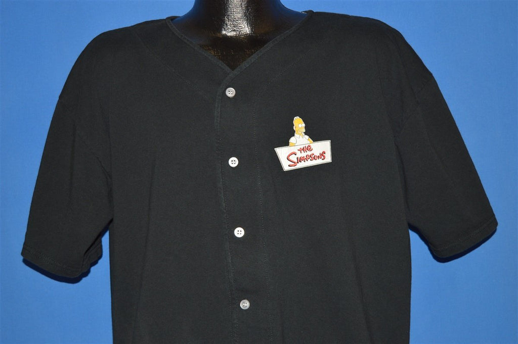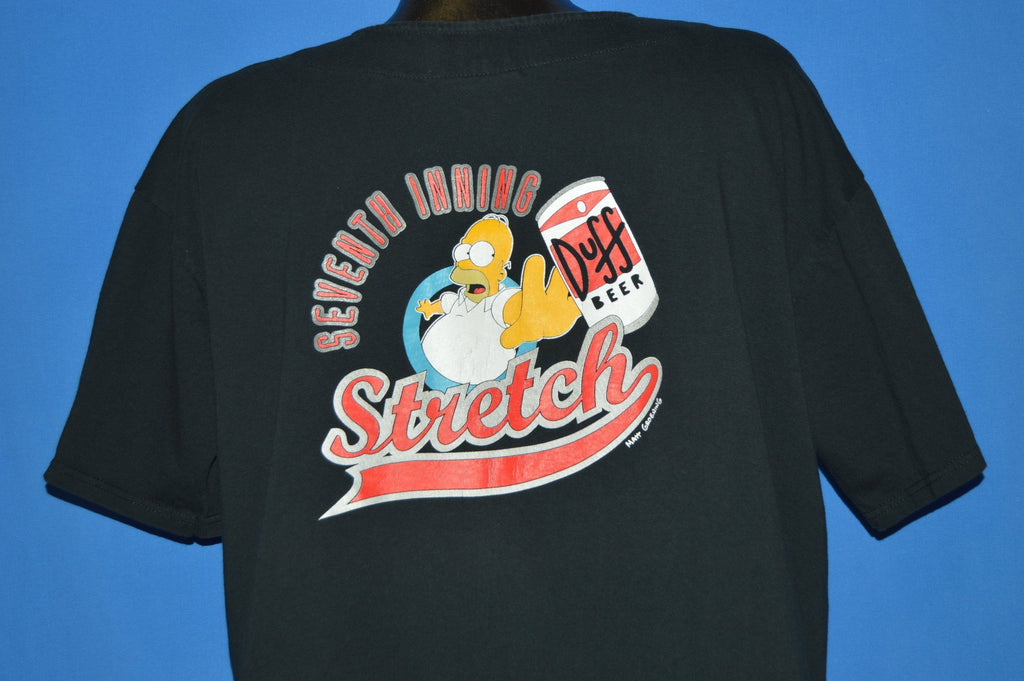 This cool baseball jersey style tee is from the 90s and features a graphic on the back of Homer Simpson reaching for a can of Duff Beer. Around him, it says "Seventh Inning Stretch". On the front, there are six button closures and another image of Homer Simpson above a card that says "The Simpsons". Seventh Inning Stretch refers to the period of a baseball game where spectators get up and stretch their arms and legs after sitting for so long.