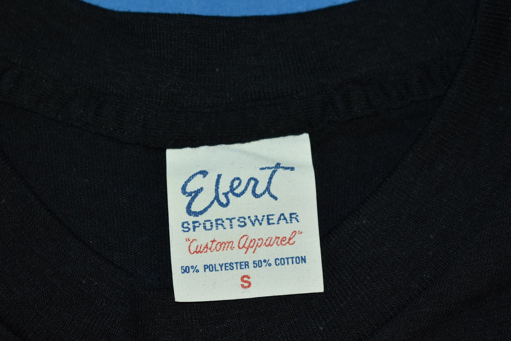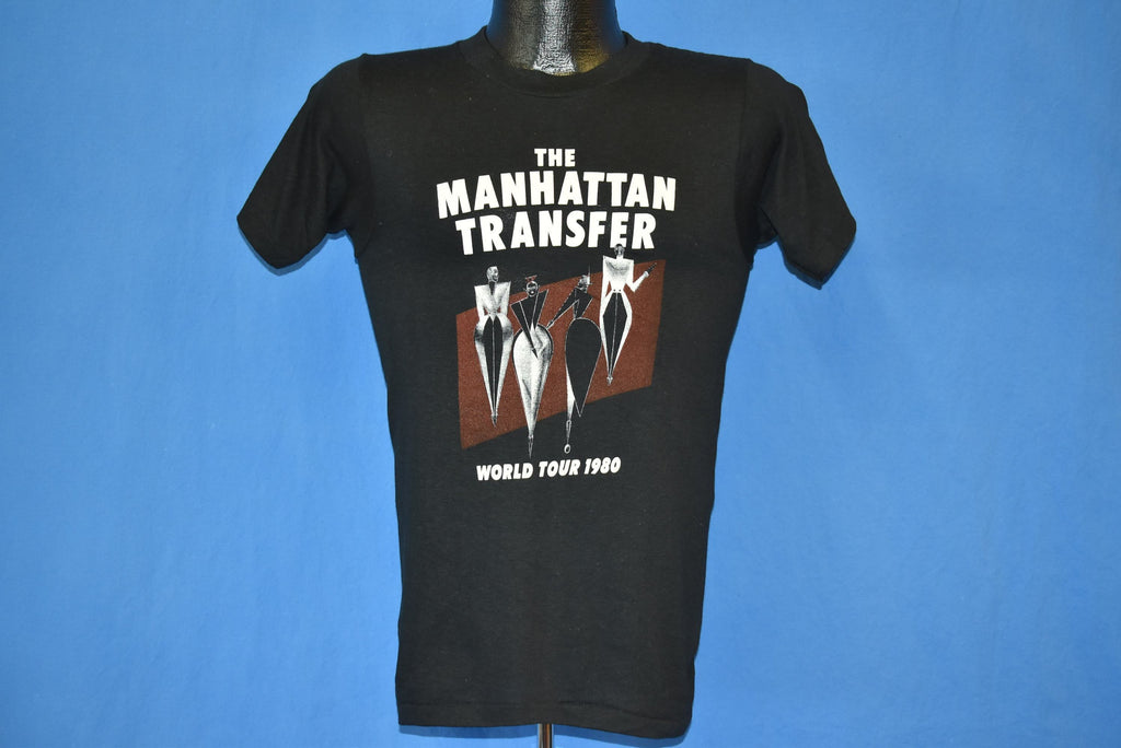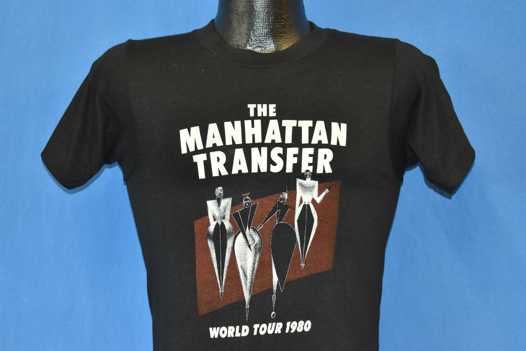 This artful vintage tee comes from singing group, The Manhattan Transfer on their 1980 World Tour. Formed by Tim Hauser in 1969, the group often performed in clubs in New York City. Their debut album was released by Atlantic Records in 1975 featuring famous jazz musicians like Randy Brecker, Jon Faddis, and Zoot Sims.