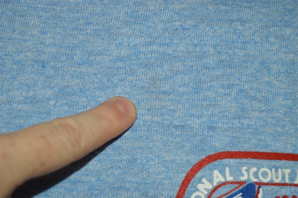 This heathered blue vintage ringer is a souvenir from the 1981 National Scout Jamboree. The graphic on the front for the major Boy Scouts of America event is an image of George Washington facing a young scout. That year the event was held at Fort A.P. Hill in Virginia and the theme was Scout's Reunion with History. The event, which is held roughly every four years, continued to be held at Fort A.P. Hill for several consecutive years, all the way up until 2010.