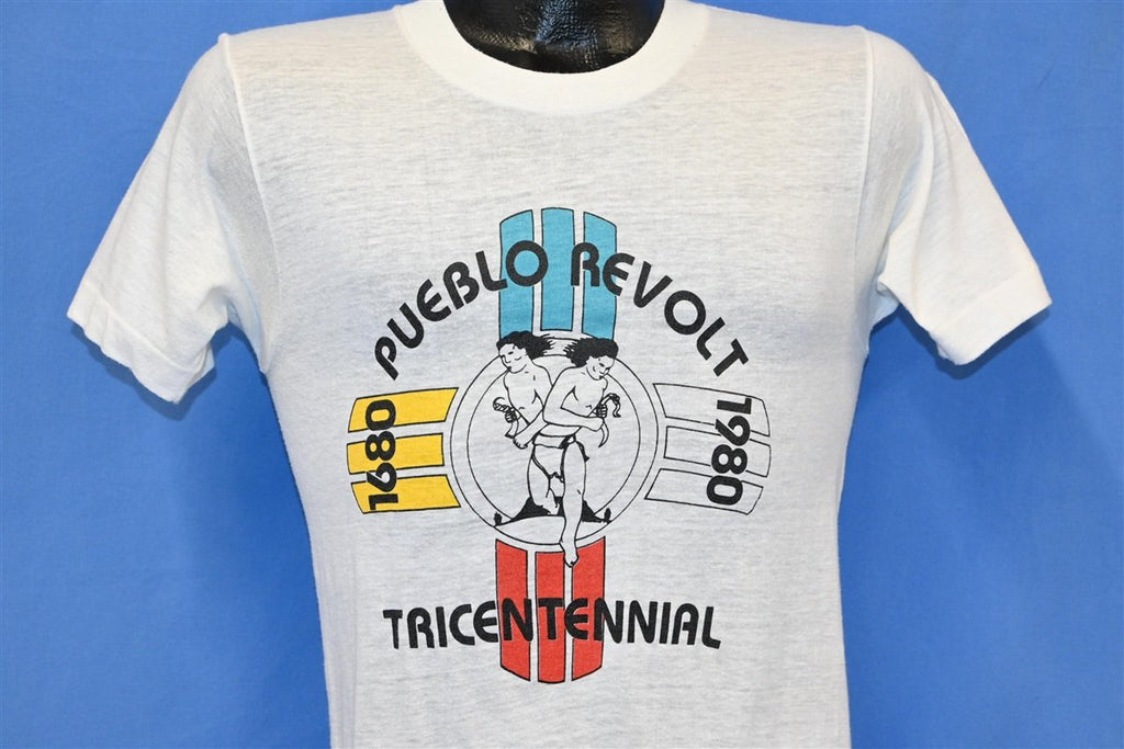 This vintage tee commemorates the tricentennial celebration of the Pueblo Revolt of 1680. Also known as Pope's Rebellion, this historic event saw the indigenous Pueblo people, of modern-day New Mexico, launch a successful uprising against the Spanish colonizers occupying their land. The revolt's 300th anniversary was celebrated in 1980 with a variety of cultural events that demonstrated the rich culture that the Native Pueblo people fought to uphold.