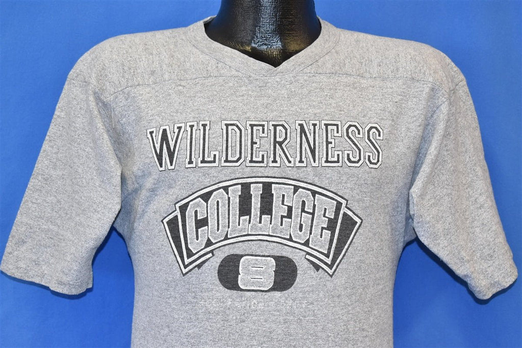 This 80s jersey tee features a sweet heather gray color and v-neck collar. The graphic reads, "Wilderness College." There are dozens of outdoor schools in America, but the most renown is Alderleaf Wilderness College in Washington. The educational institution specializes in teaching wilderness survival, wildlife tracking, and permaculture.