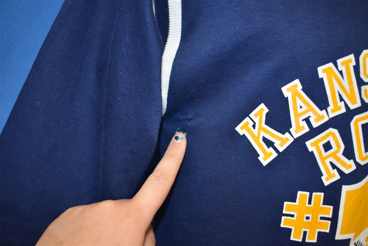 This shirt fits like a modern unisex adult Medium. It has repairs near the pit and on top of the shoulder, see pics.