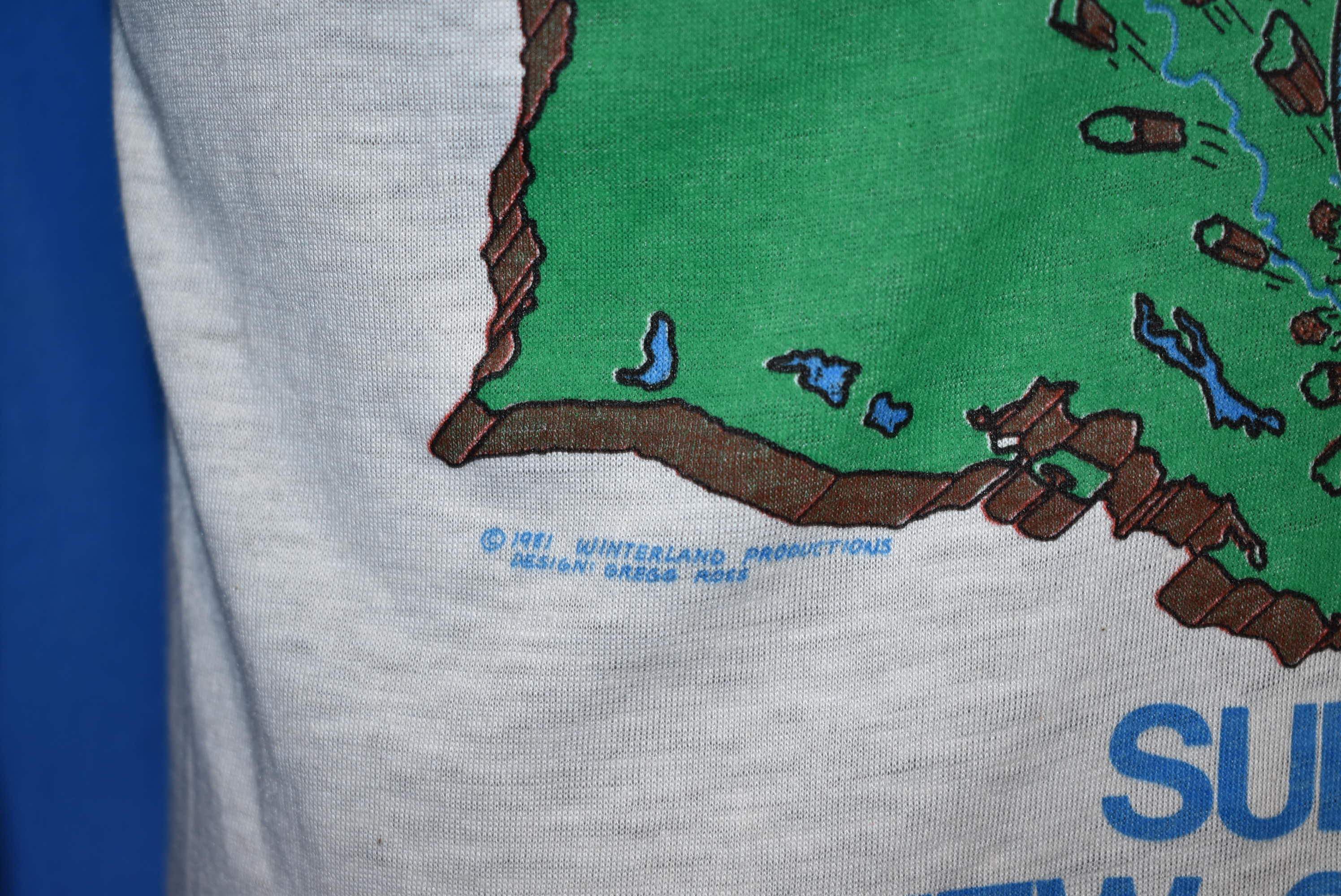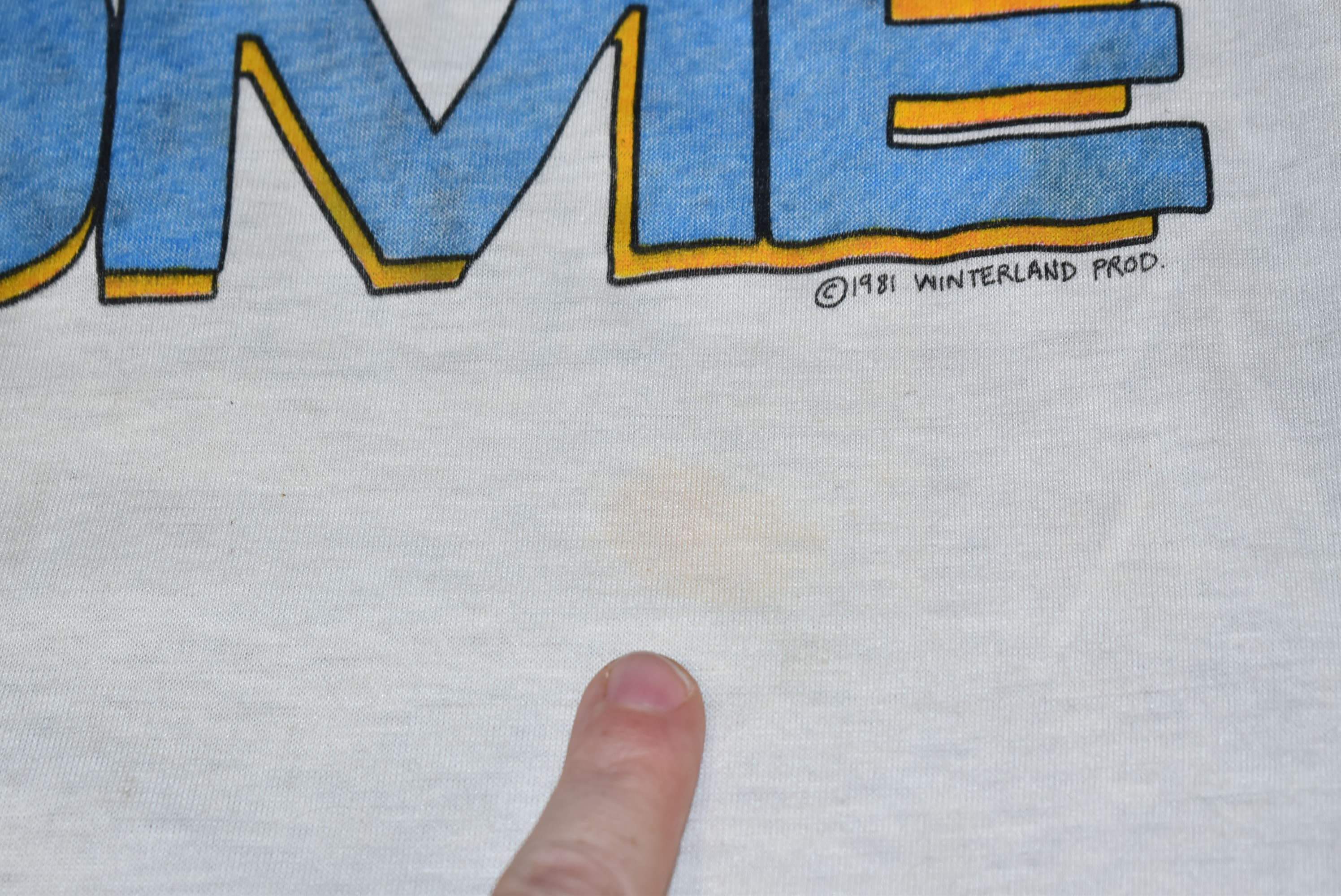 This shirt fits like a modern unisex adult small. It has a small spot underneath the graphic, see pics. This shirt is unworn, deadstock from 1981.