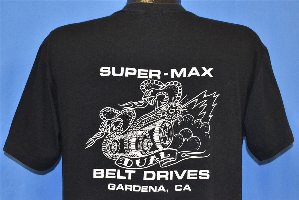 This epic Harley promo tee was made for Super-Max Belt Drives auto parts store in Gardena, California. It's held up beautifully after all these years and truly captures that old school look and feel. Features double sided print, amazing poly cotton blend, and big bold graphics.