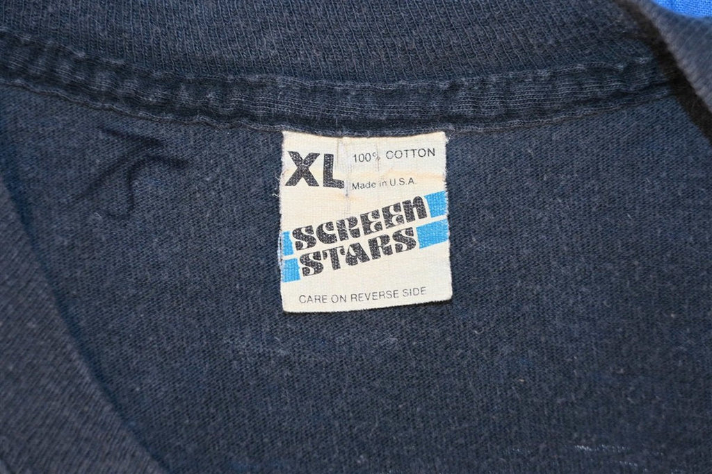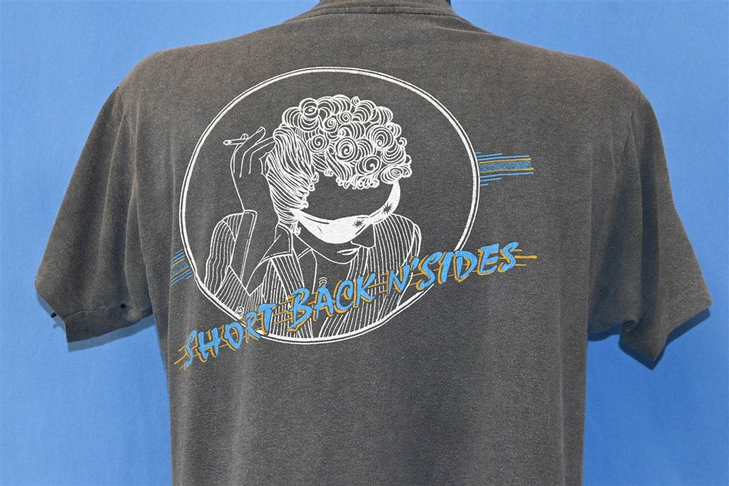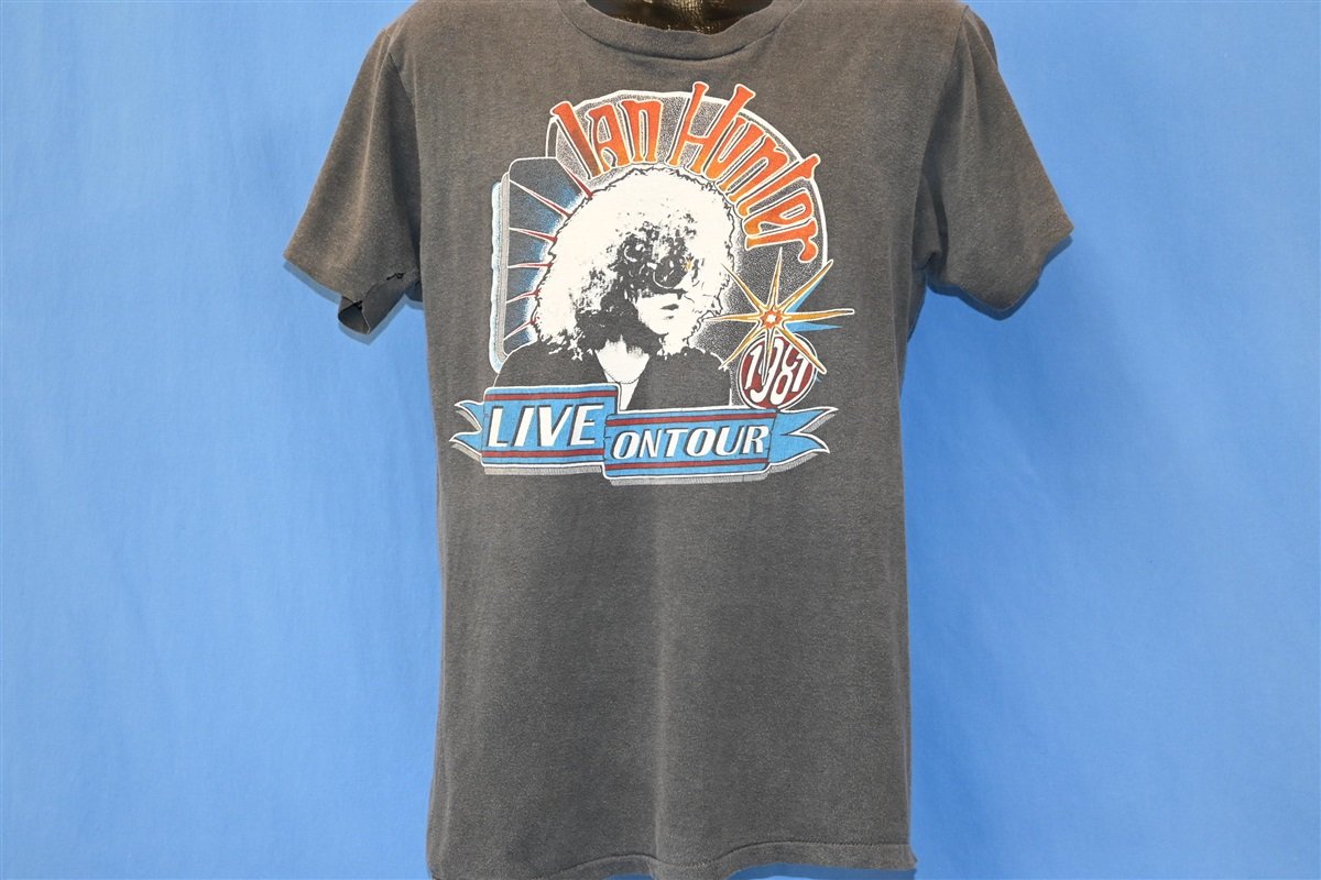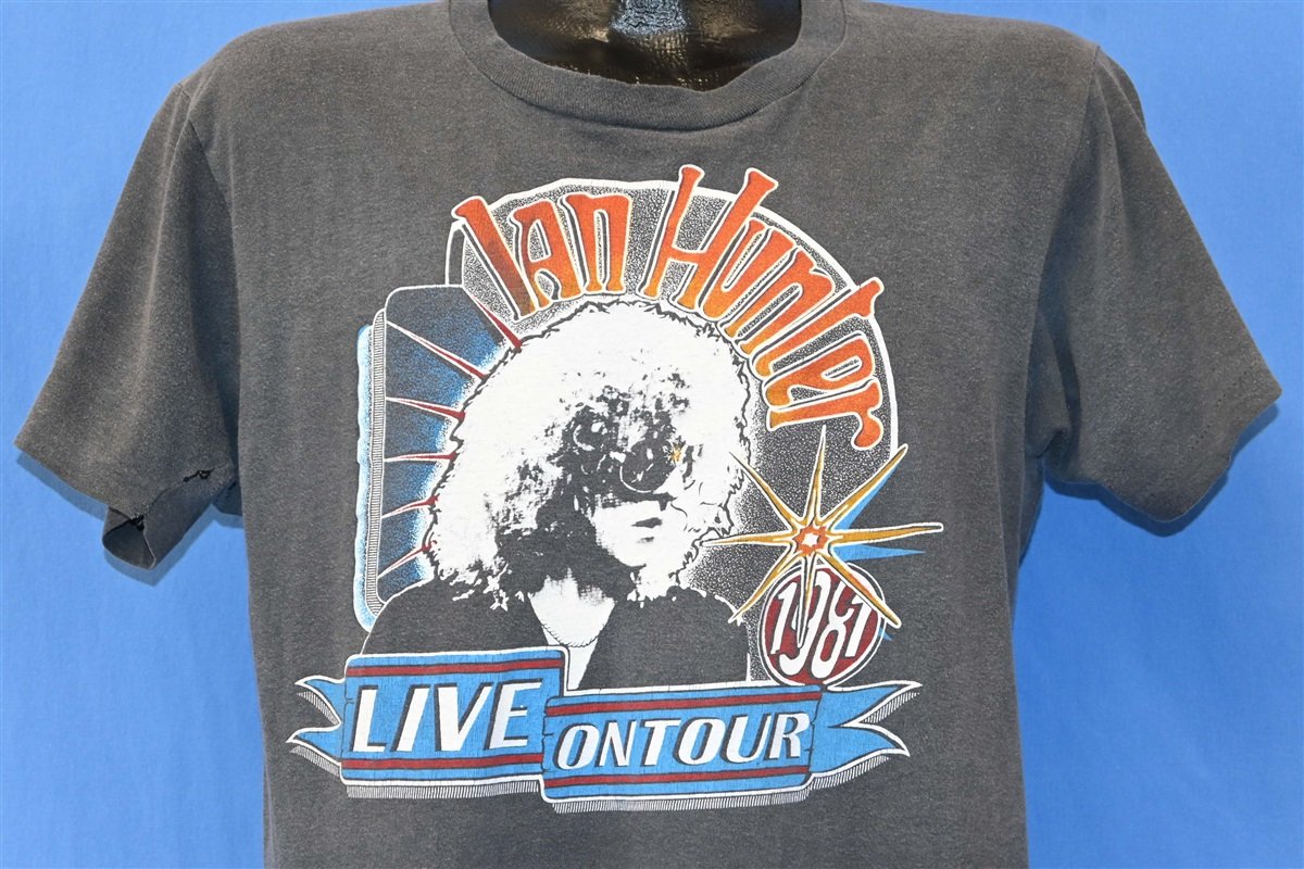 This sweet faded rock tee commemorates a 1981 concert tour starring the English musician, Ian Hunter. Hunter is often remembered for his tenure as the lead vocalist of the band Mott the Hoople, as well as the original artist behind the song "Once Bitten, Twice Shy", which was later covered by the band Great White. This tee was designed for the promotional tour for Hunter's fifth studio solo album, Short Back 'n' Sides.