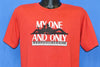 This sweet bright red t-shirt features a logo for the musical My One and Only, which first premiered on Broadway back in 1983. The musical was written by Peter Stone and Timothy S. Mayer, and it incorporates the classic tunes of the talented 1920s musical duo of George and Ira Gershwin. The musical is set in 1927, and the plot involves the misadventures of a pair of potential lovers. When the show premiered at the St. James Theater, the cast included Bunny Briggs, Roscoe Lee Browne, Denny Dillon, Nana Visitor, Charles Coles, Tommy Tune, and 60s cultural icon and model Twiggy.