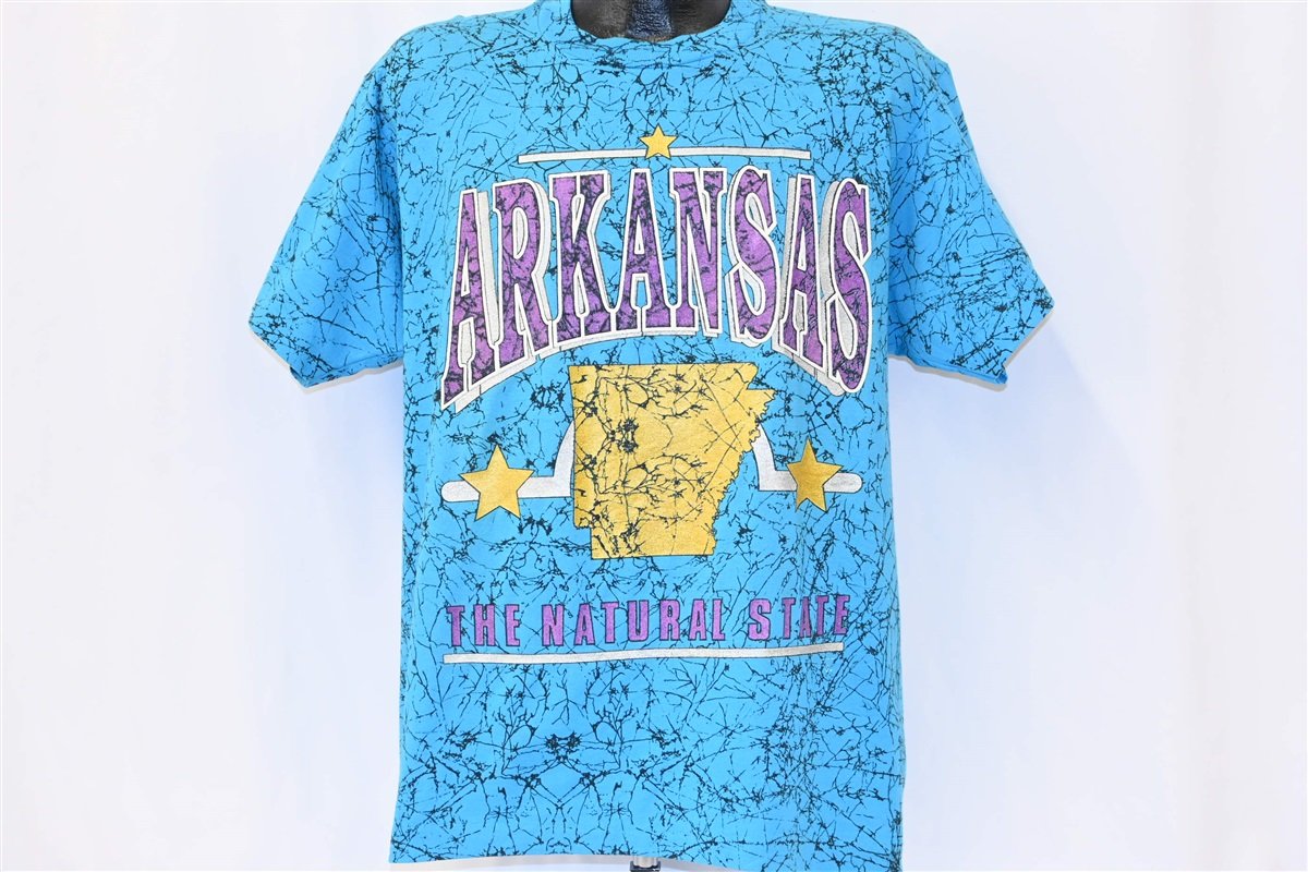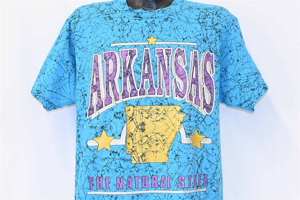 This cool 90s tee has a sweet all over print design of an abstract crackle pattern, and the tee celebrates Arkansas, which is known as "the Natural State". Arkansas earned this nickname thanks to its abundant natural landscapes that include mountains, rivers, lakes, and forests. Arkansas is also home to the country's only public diamond mine.