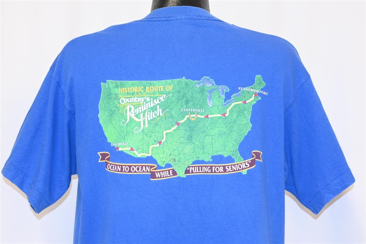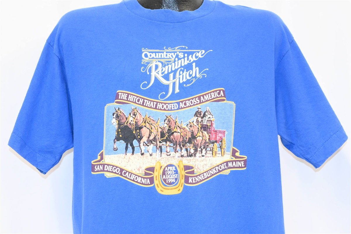 This sweet tee was made to commemorate the 1993 Country's Reminisce Hitch, a cross county journey. This adventure involved a newlywed couple, who took a six-horse hitch of Belgian horses from the West Coast to the East Coast. The voyage began in April of 1993 in San Diego, California and concluded in August of 1994 in Kennebunkport, Maine. The group attracted visitors across their whole journey, as the hitch was ranked the top six-horse hitch in America in 1992.