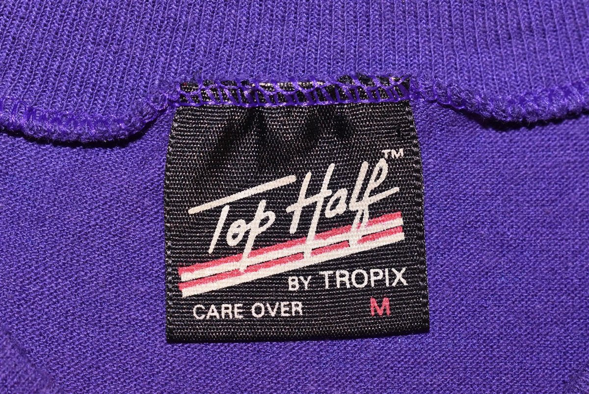This vintage tee is a 1980s original and held up great over the years. It's loaded with awesome graphics, soft poly cotton, and a classic Top Half by Tropix tag.