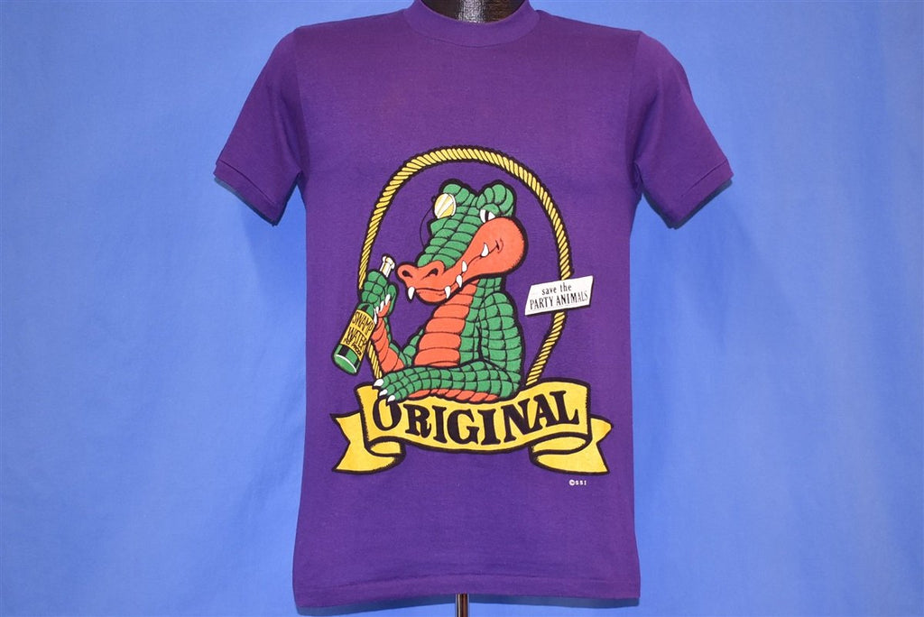 The motto is "Save the party animals" with a wild alligator repping the original party animals, 195 proof Swamp Water in hand. This is probably spoofing the iconic Bud Light mascot of the 1980s, Spuds MacKenzie aka The Original Party Animal.