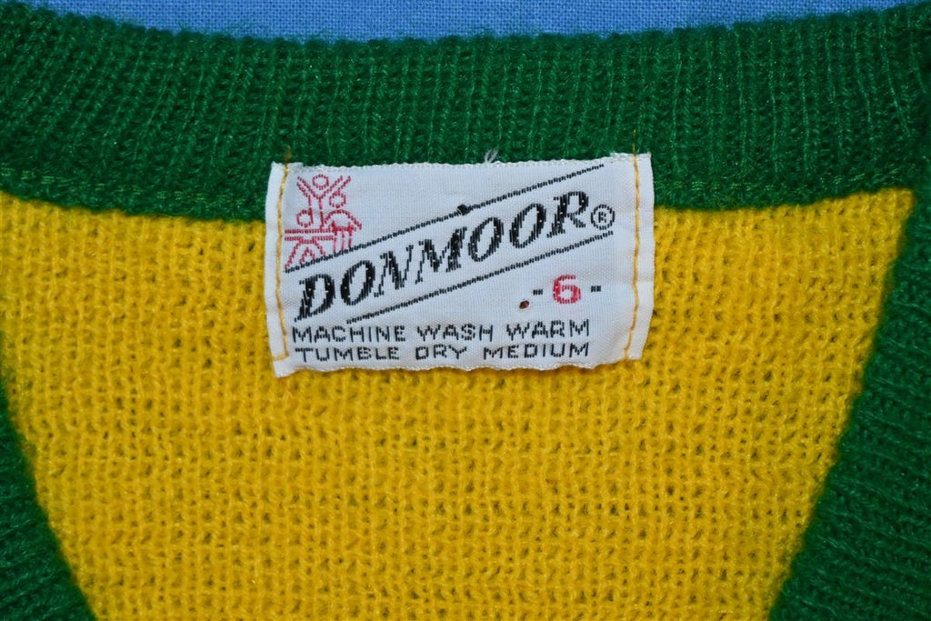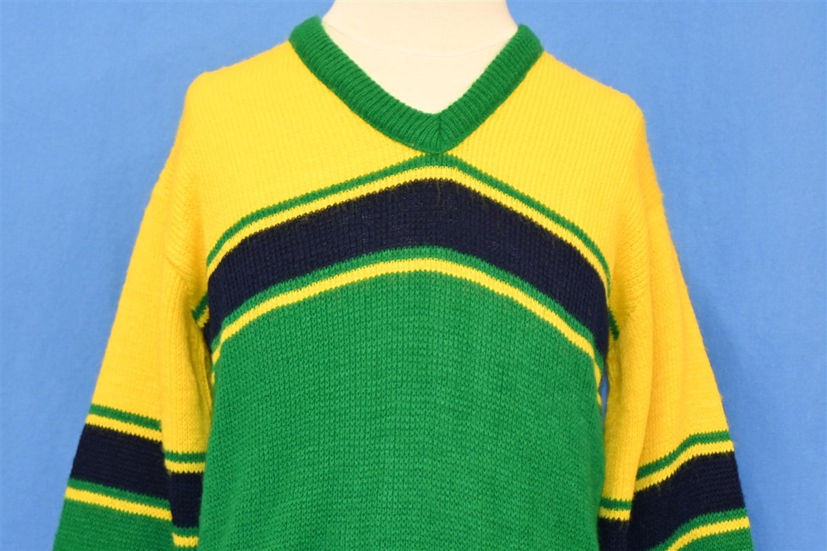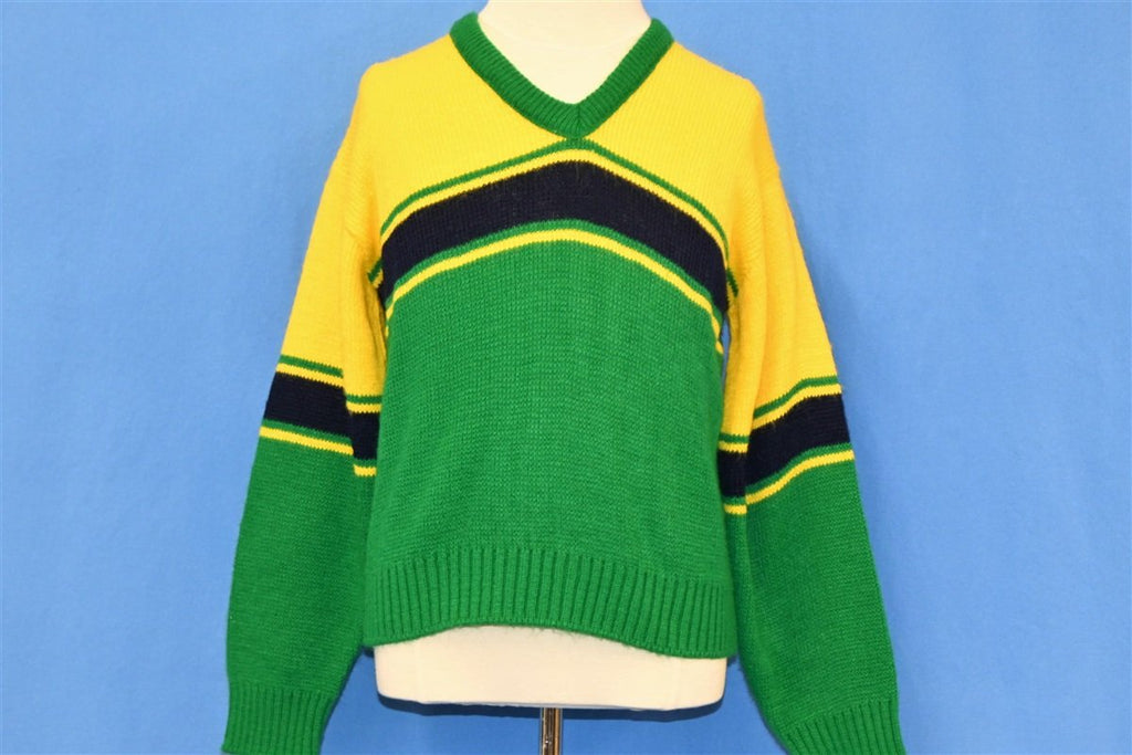 This awesome youth sweater dates back to the 80s and it has a lot left to give. It features vibrant shades of yellow and green with black accents in a striped pattern on the chest and sleeves. This pullover also has a rib knit v-neck collar, waistband, and sleeve cuffs.