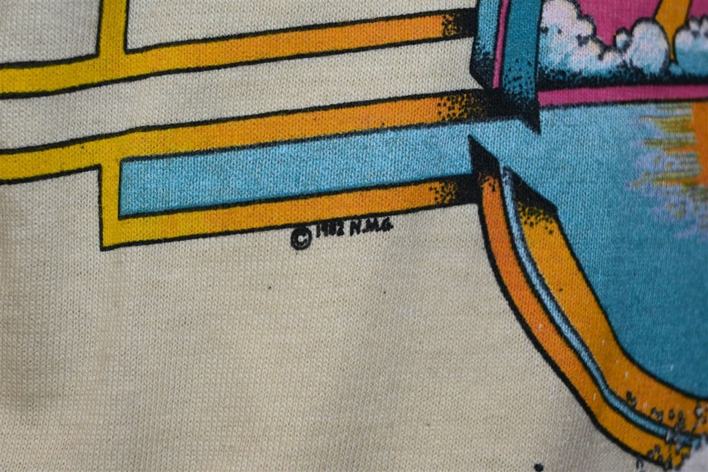 This wonderful long sleeve tee is a sweet piece of kid's surfwear from the 80s. This shirt celebrates surf culture with a beautiful sunset graphic that features bright colors inspired by the beach.