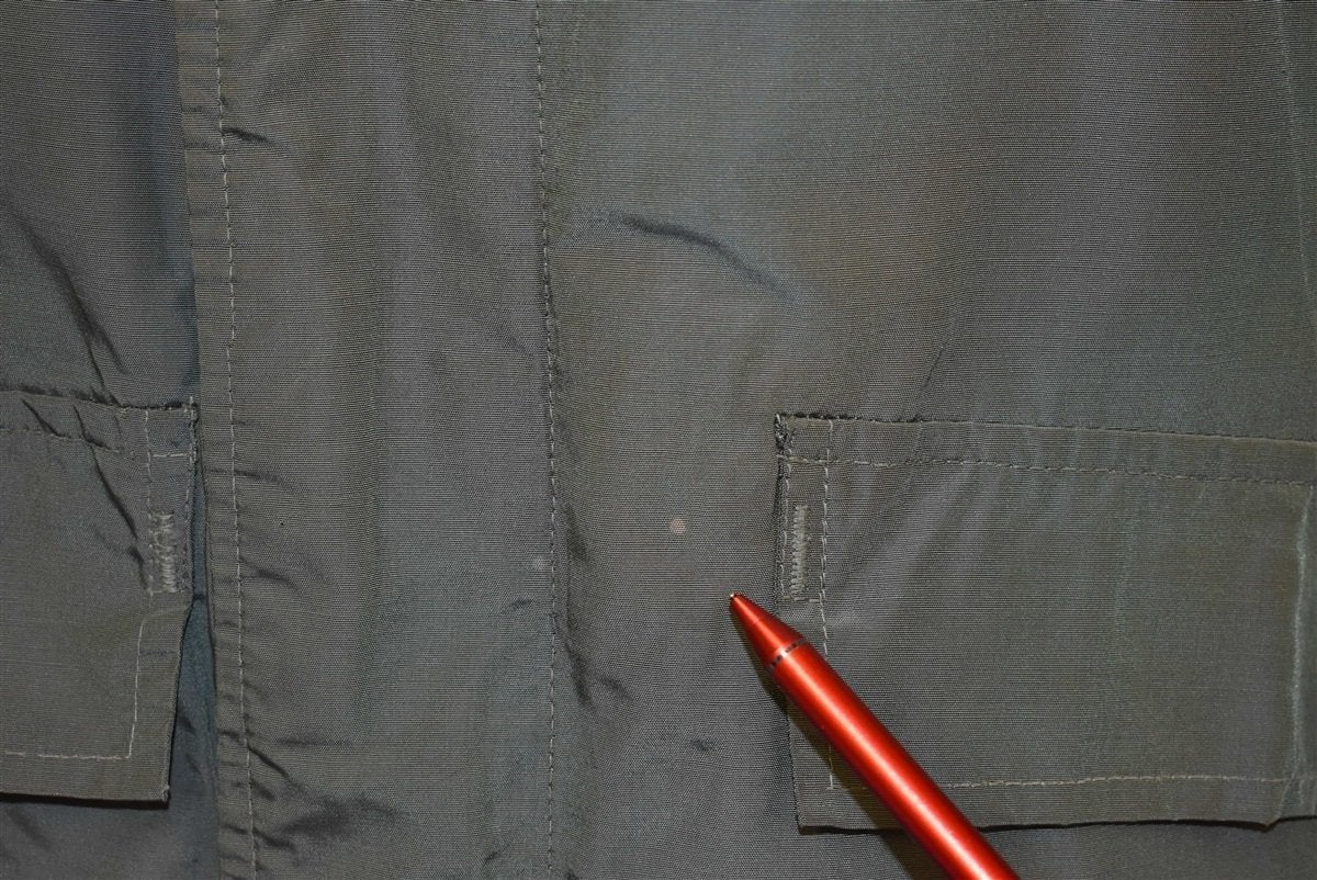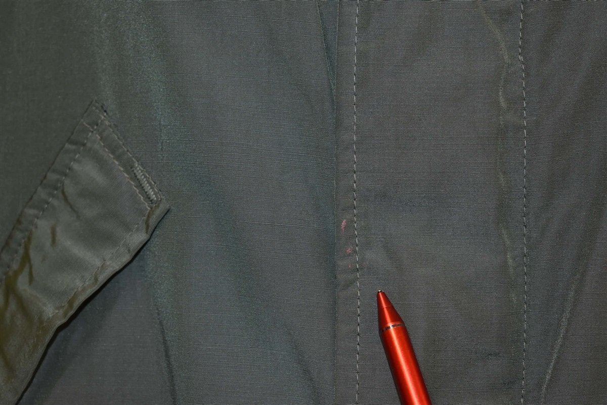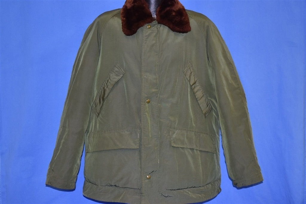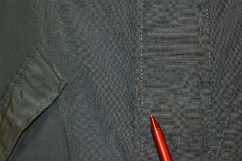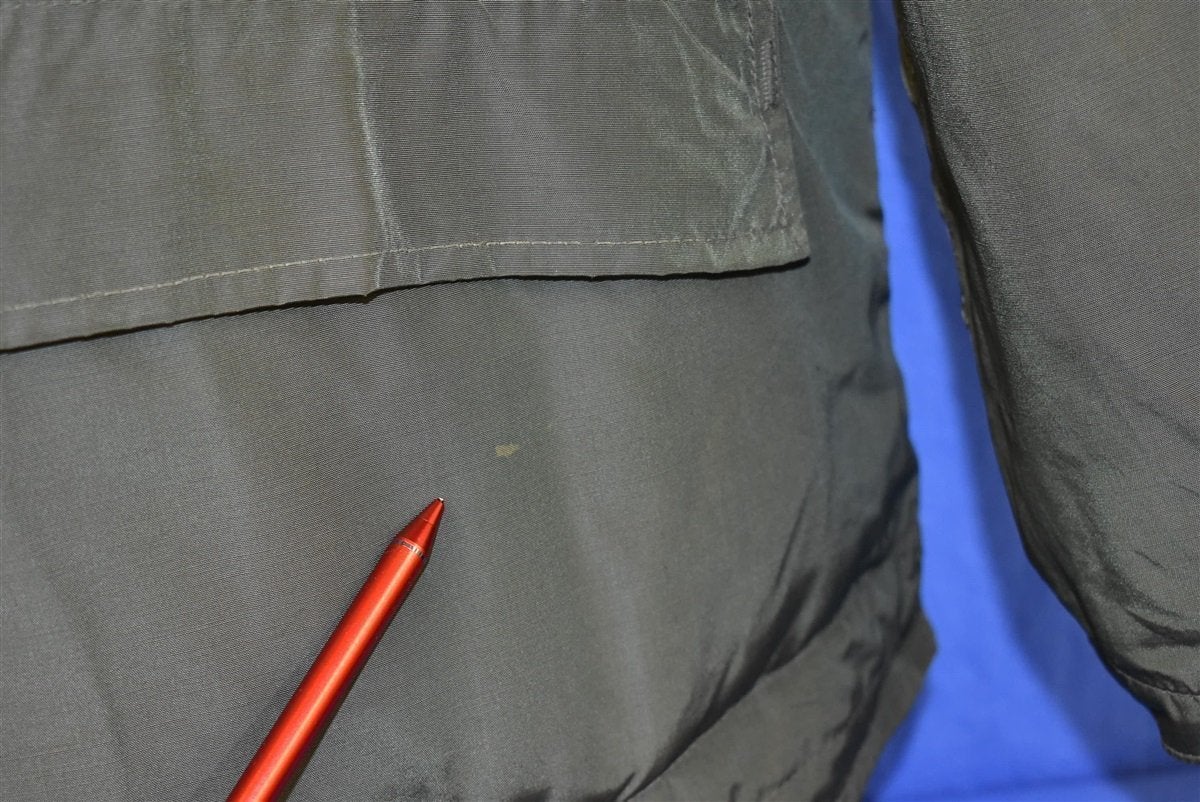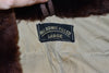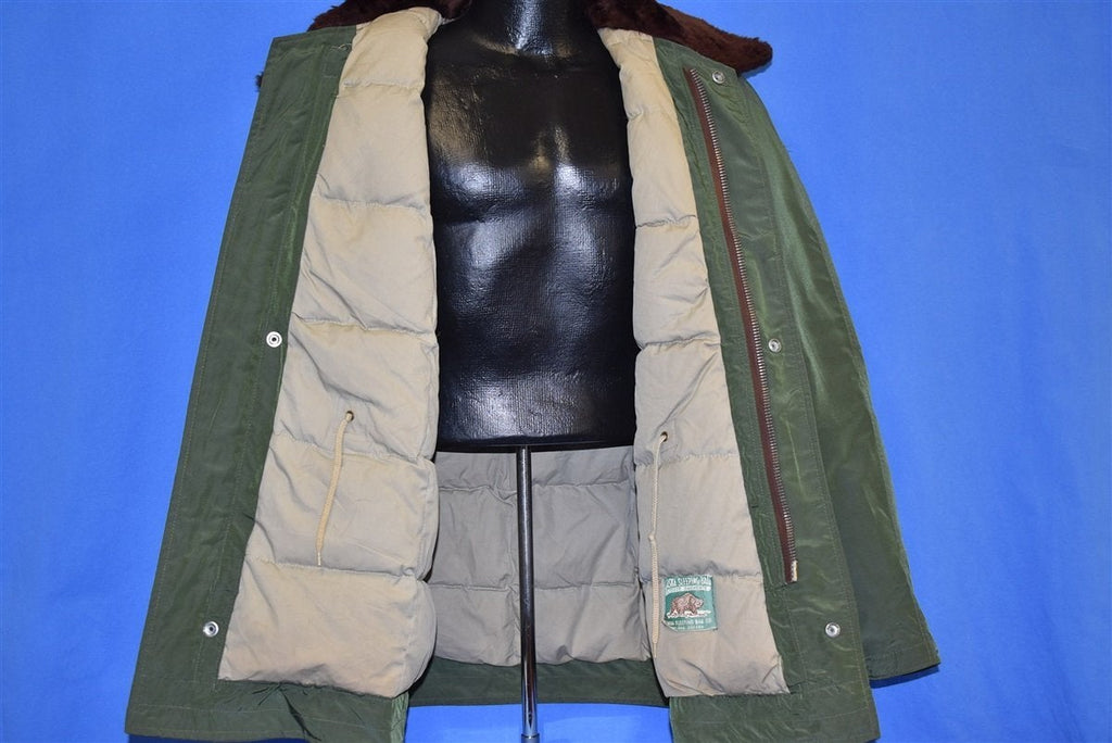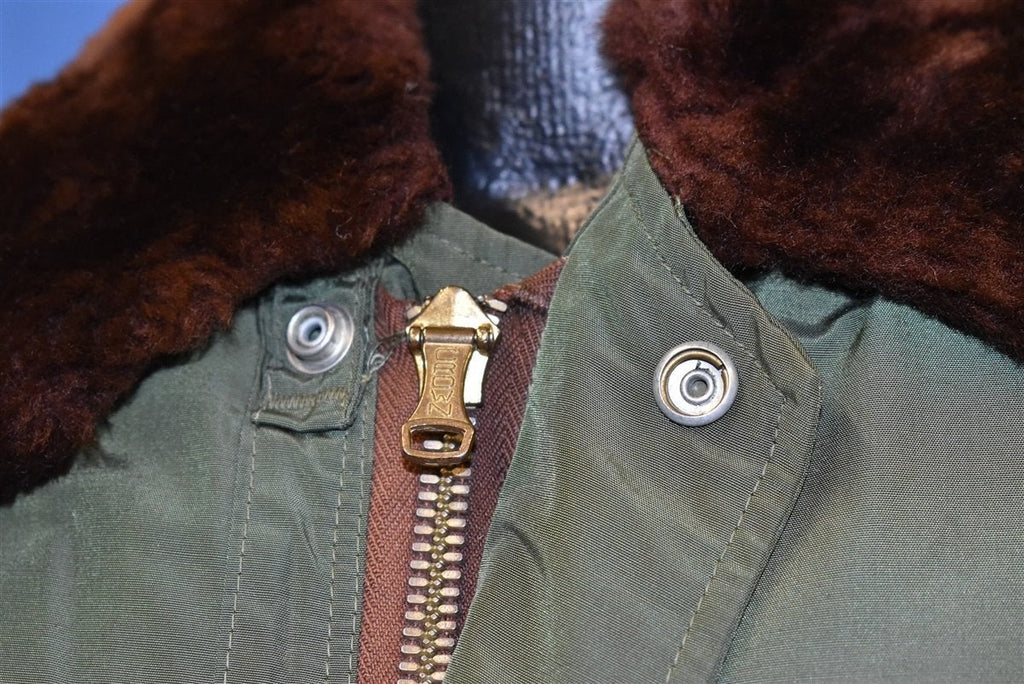 This vintage jacket was made back in the 50s by the Alaska Sleeping Bag Outdoor Garments company. The jacket is down filled and comes in an olive green color with brown fur lining the collar.The jacket is designed to be a civilian version of the deck jackets used by the United States Navy. It has a metal loaded crown zipper closure as well as snap closures to help keep the cold out. It also has four front pockets.