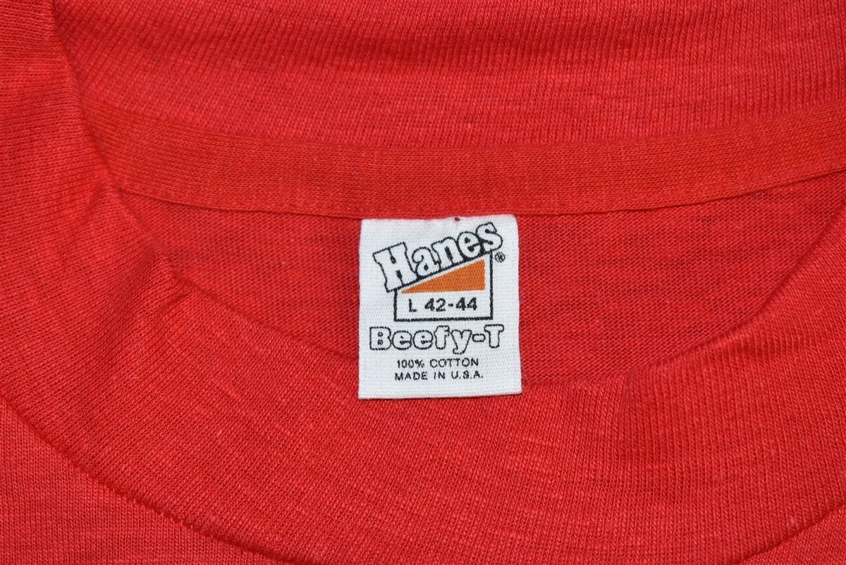 The tag says large but this shirt fits like a modern unisex adult medium. This shirt is deadstock, unworn and it will shrink a little in the wash the first time.