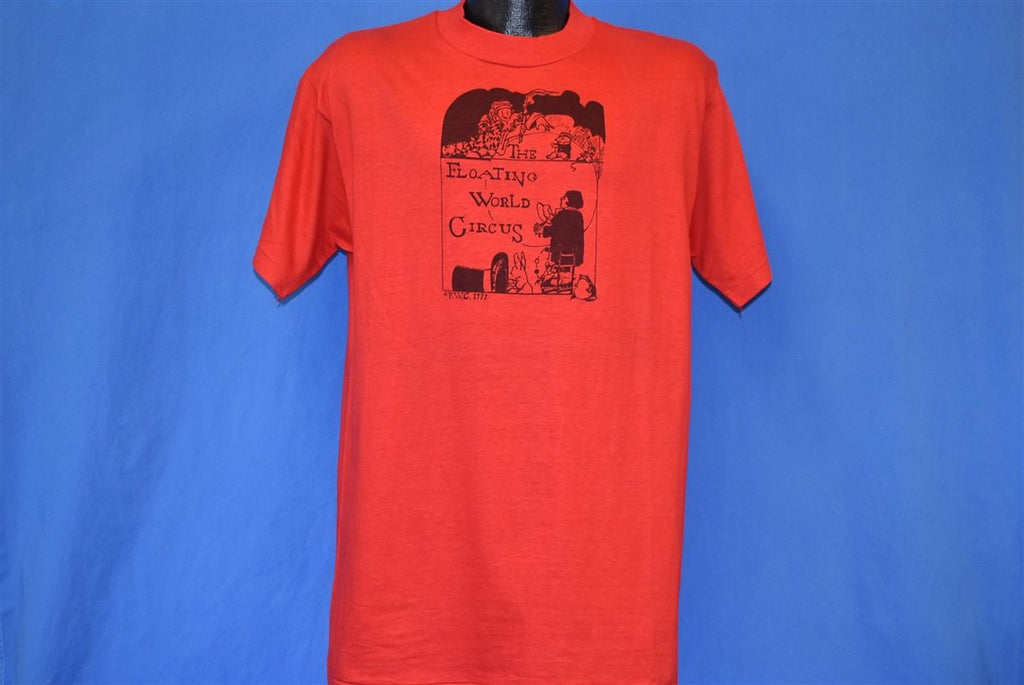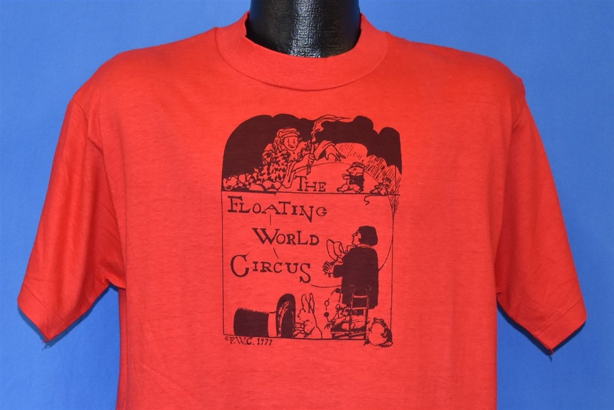 This awesome bright red t-shirt is for the Floating World Circus, a one ring professional circus from back in the 1970s. The circus was founded in 1976 in Seattle, Washington by professional juggler, Greg Albert. The circuses performers were trained in dance, drama, music, gymnastics, and visual arts with some of them serving as instructors at the Cornish Institute and the University of Washington's Experimental College. They used one ring in order to uphold European circus tradition and maintain a sense of intimacy with their audience.