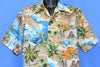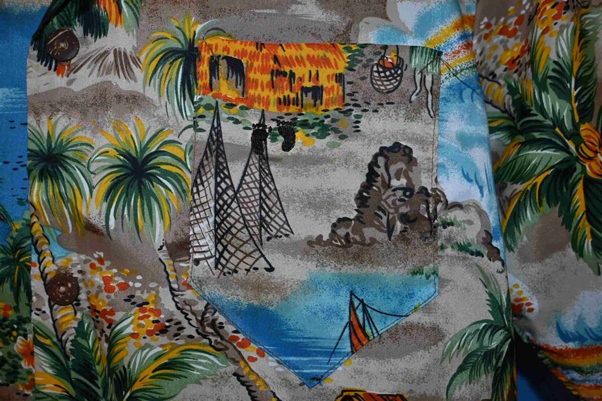 This Hawaiian shirt features an amazing novelty print that showcases a beautiful island scene. Details of the design include rainbows, lush palm trees, and flowing waterfalls. This shirt also has a single chest pocket, which has Hang Ten's bare feet logo stitched onto it.
