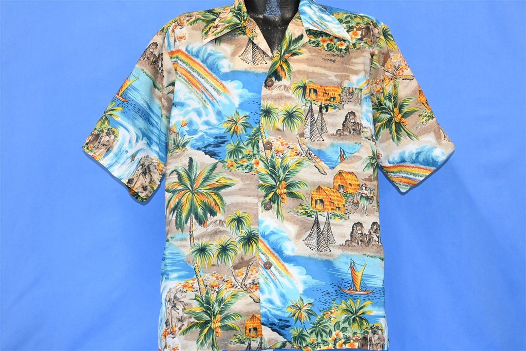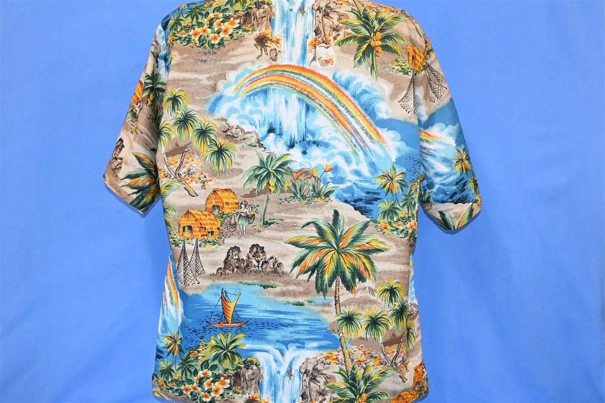 70s Hang Ten Rainbow Waterfall Scene Hawaiian Shirt Large