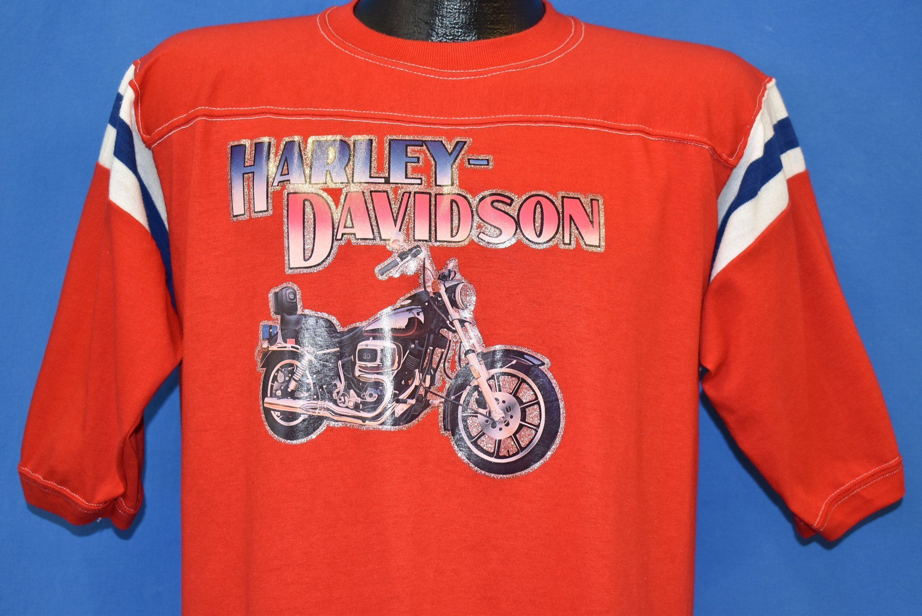 This jersey style shirt has a glitter iron on graphic of a Harley Davidson bike on the front. There are blue and white stripes on the shoulders. Harley Davidson is considered a great American brand of motorcycles. It first started in 1903 in Milwaukee, Wisconsin. It was one of two motorcycle companies to survive the Great Depression. The company is considered very American, and is often shown alongside American motifs like flags and eagles.