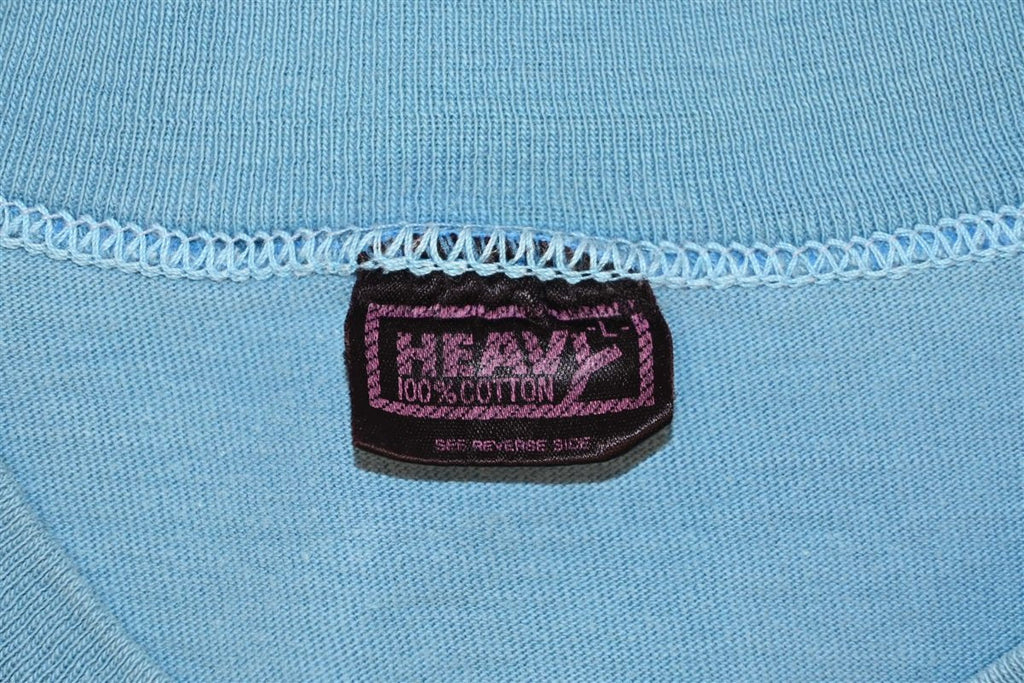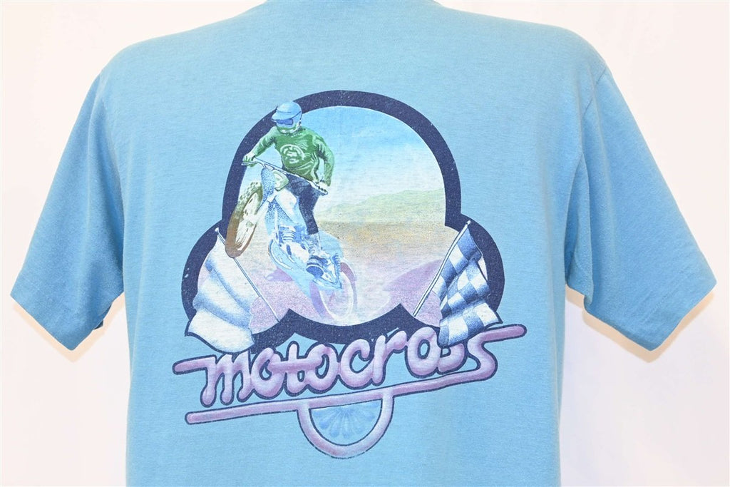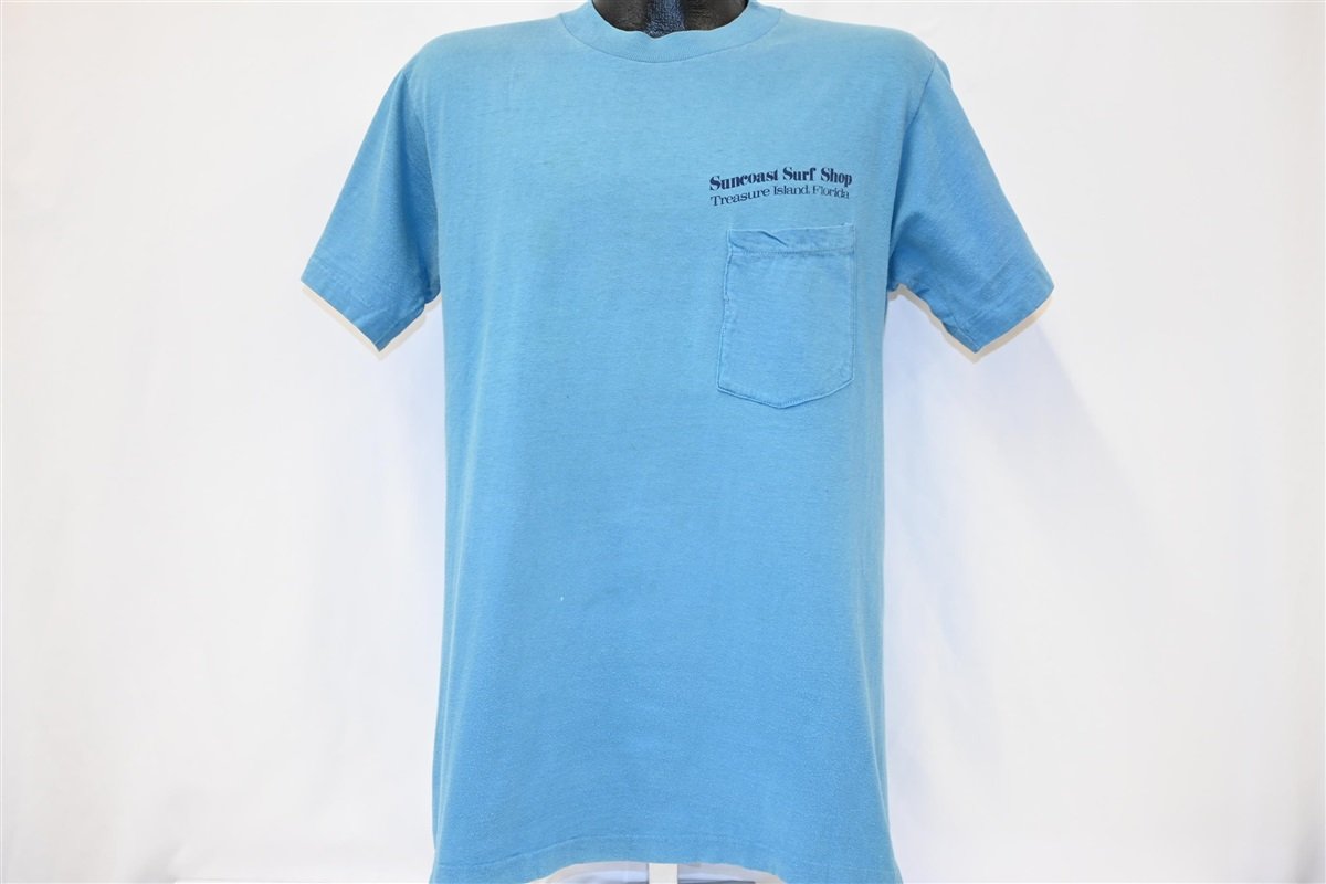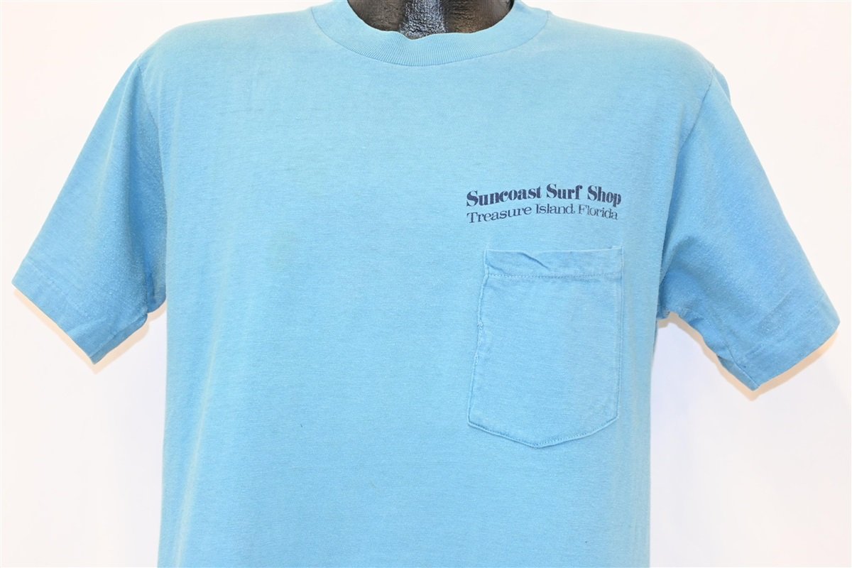 This 70s tee was made to promote Suncoast Surf Shop in Treasure Island, Florida. The front of this tee features a pocket and the shop's name, while the back showcases a dynamic motocross graphic. Suncoast Surf Shop opened in the 60s and they claim to have been the first surf shop on the gulf coast. During the time this tee was made, motocross was quickly gaining popularity as a sport, and the American Motorcyclist Association held their inaugural Motocross Championships in 1972.