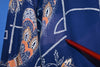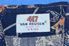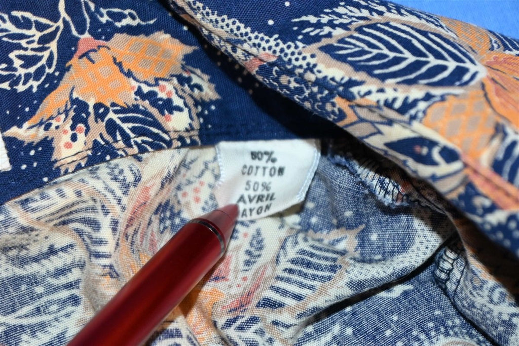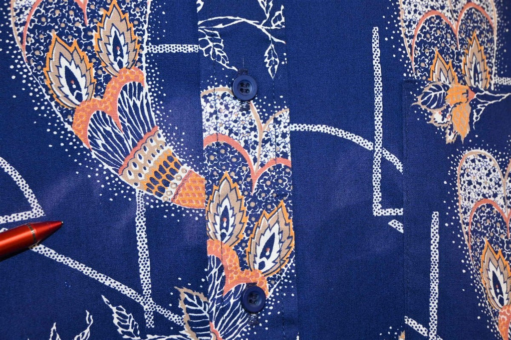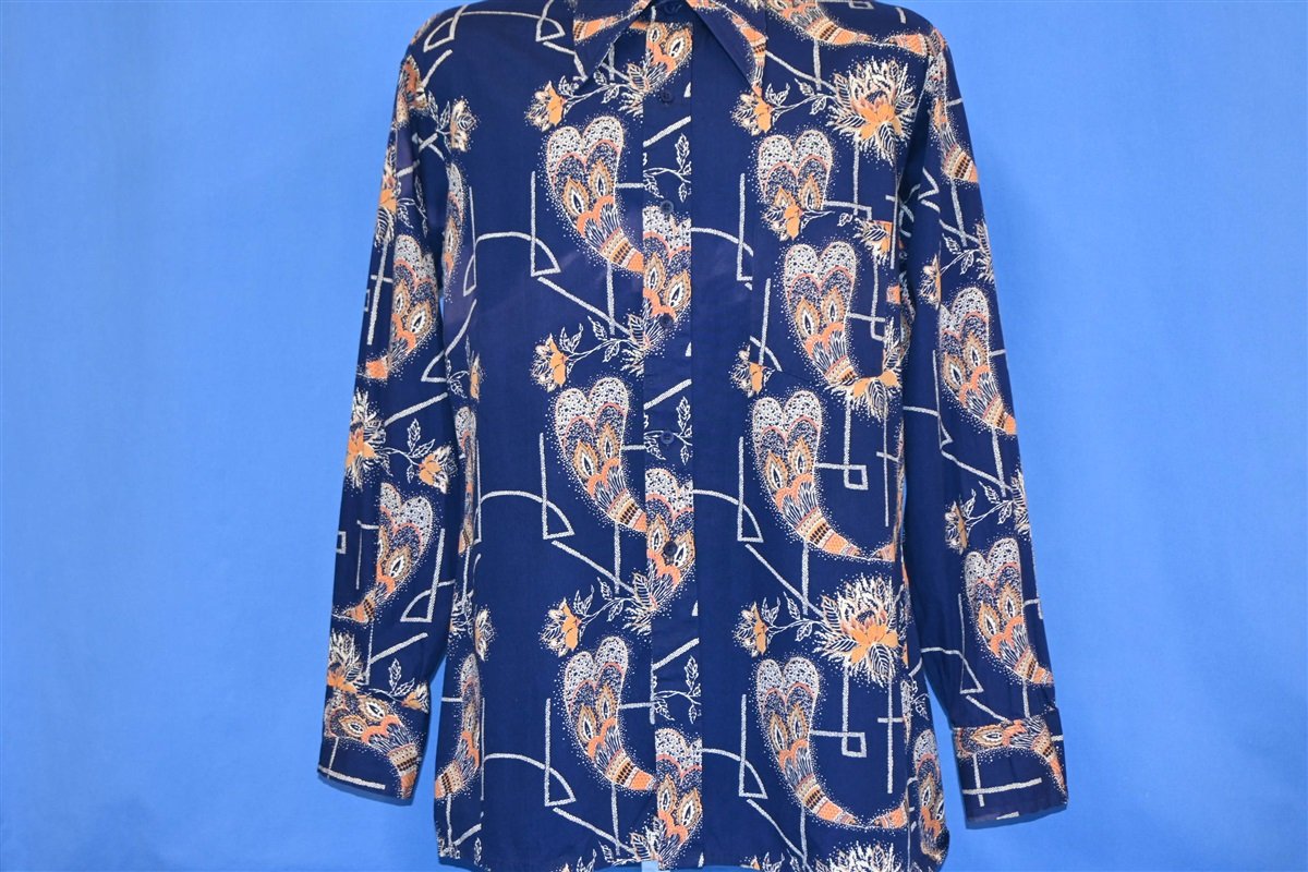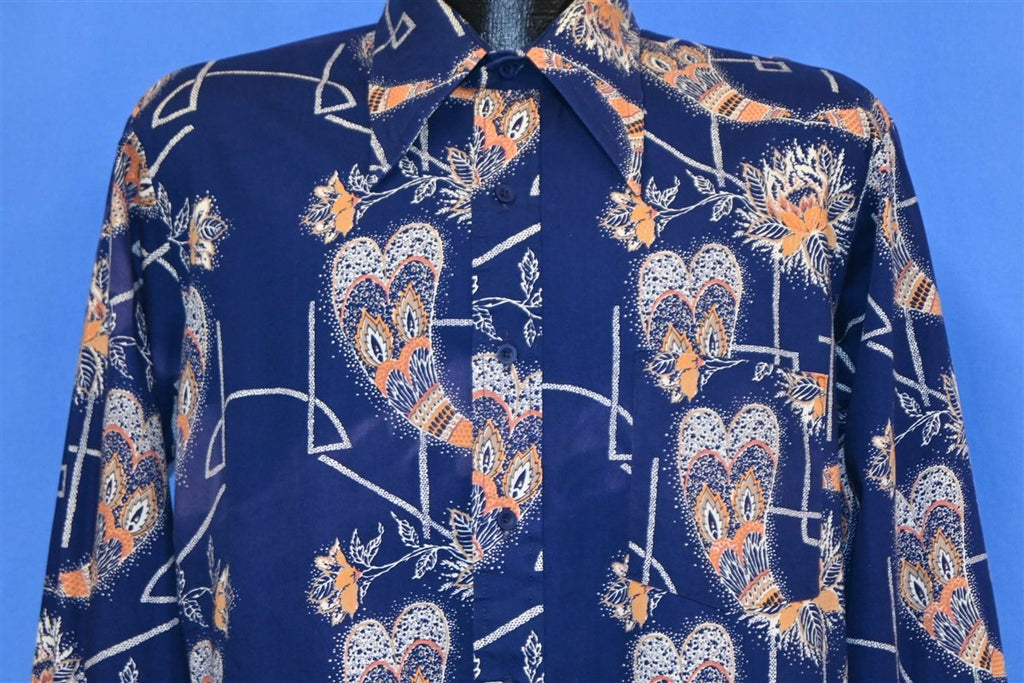 This cool vintage button down was made in the 70s and it features the sort of big style collar that used to be popular during the decade. This shirt was made by the classic apparel brand Van Heusen, and it features an intricate floral pattern printed over a navy blue backdrop. This shirt is made from a lightweight cotton rayon blend, and it has a single chest pocket on the front.