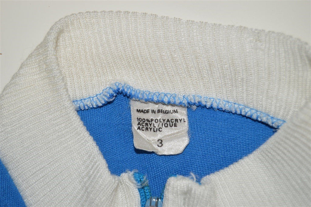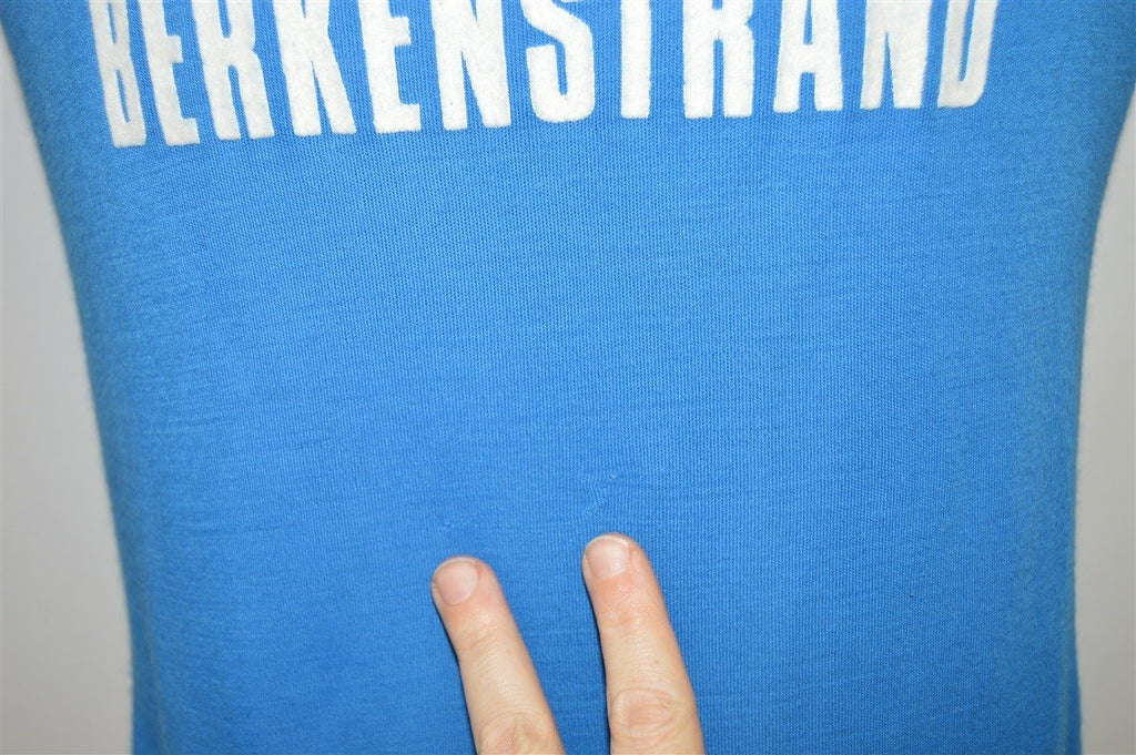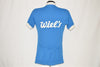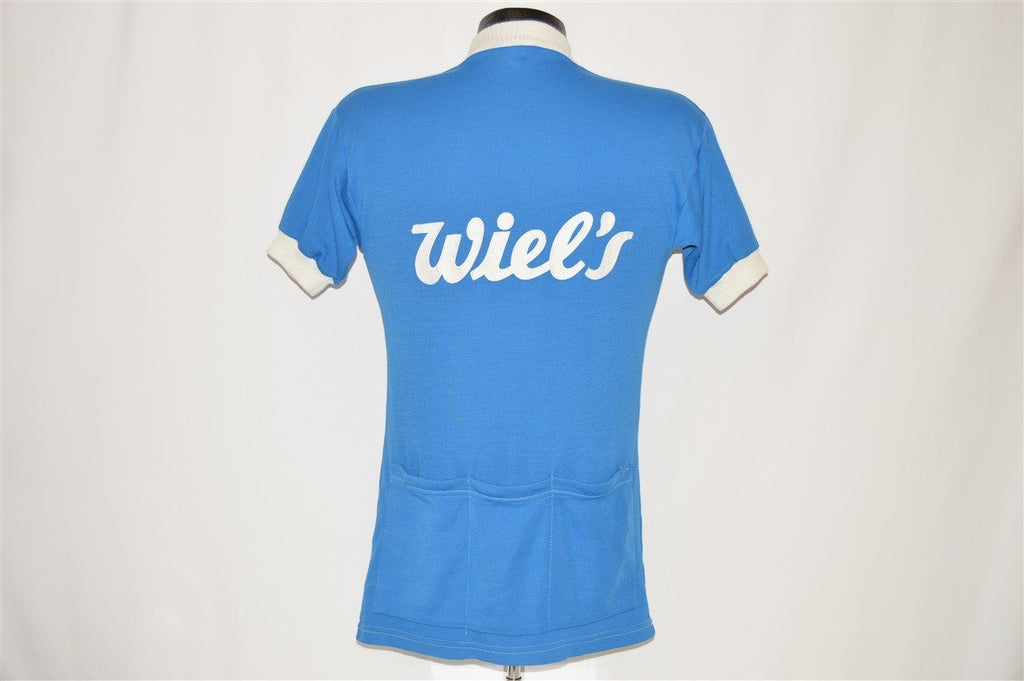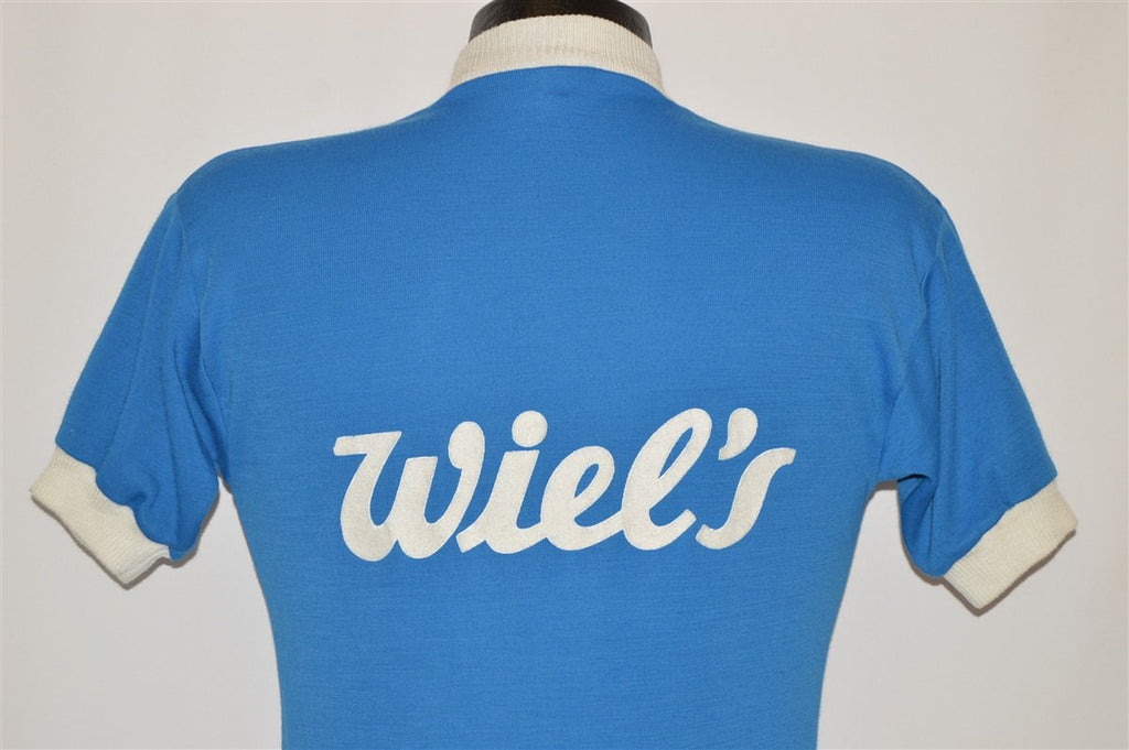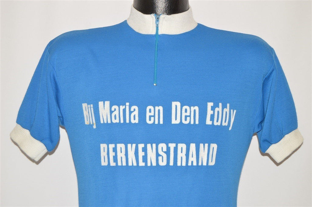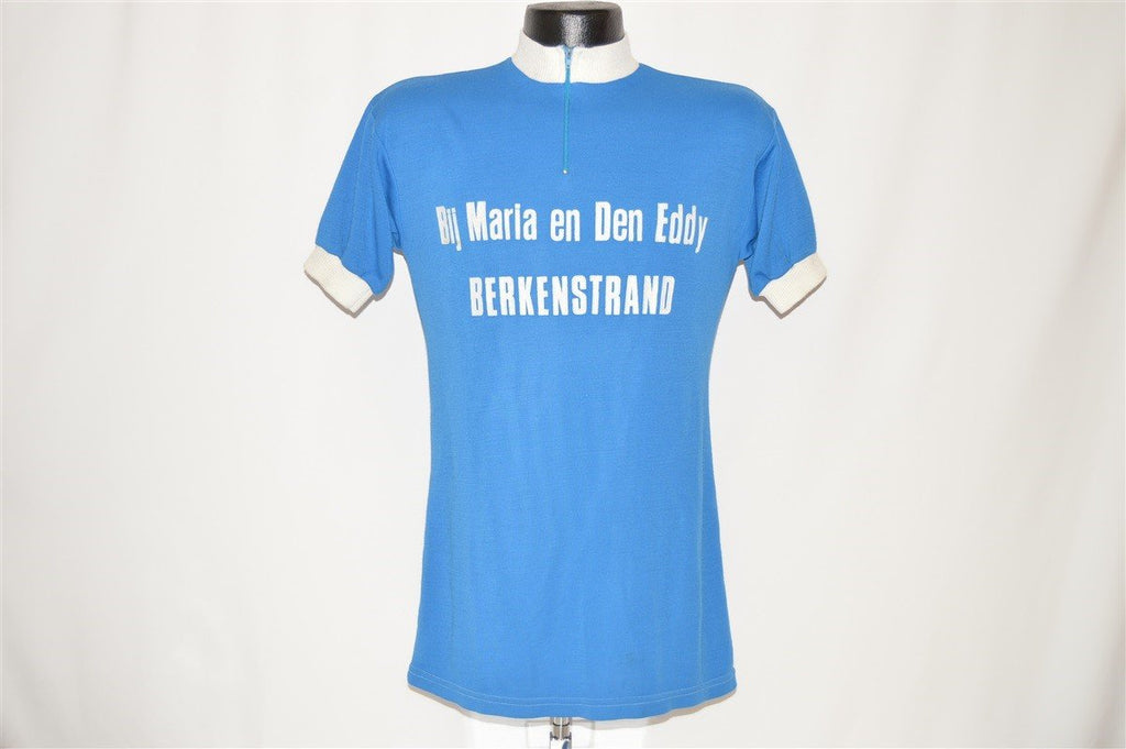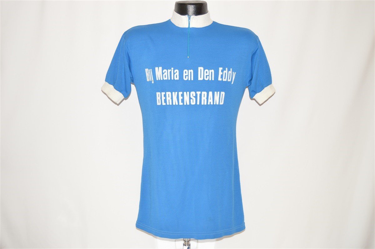 This bright blue shirt is in the style of a cycling jersey with a pullover style zipper at the neck, which enables a tight fit. The shirt is from the 1970s and features the Dutch words "Bij Maria en Den Eddy Berkenstrand" on the front, and "Weil's" on the back. Berkenstrand is a park in Belgium which is has cycling and hiking routes and camp grounds.