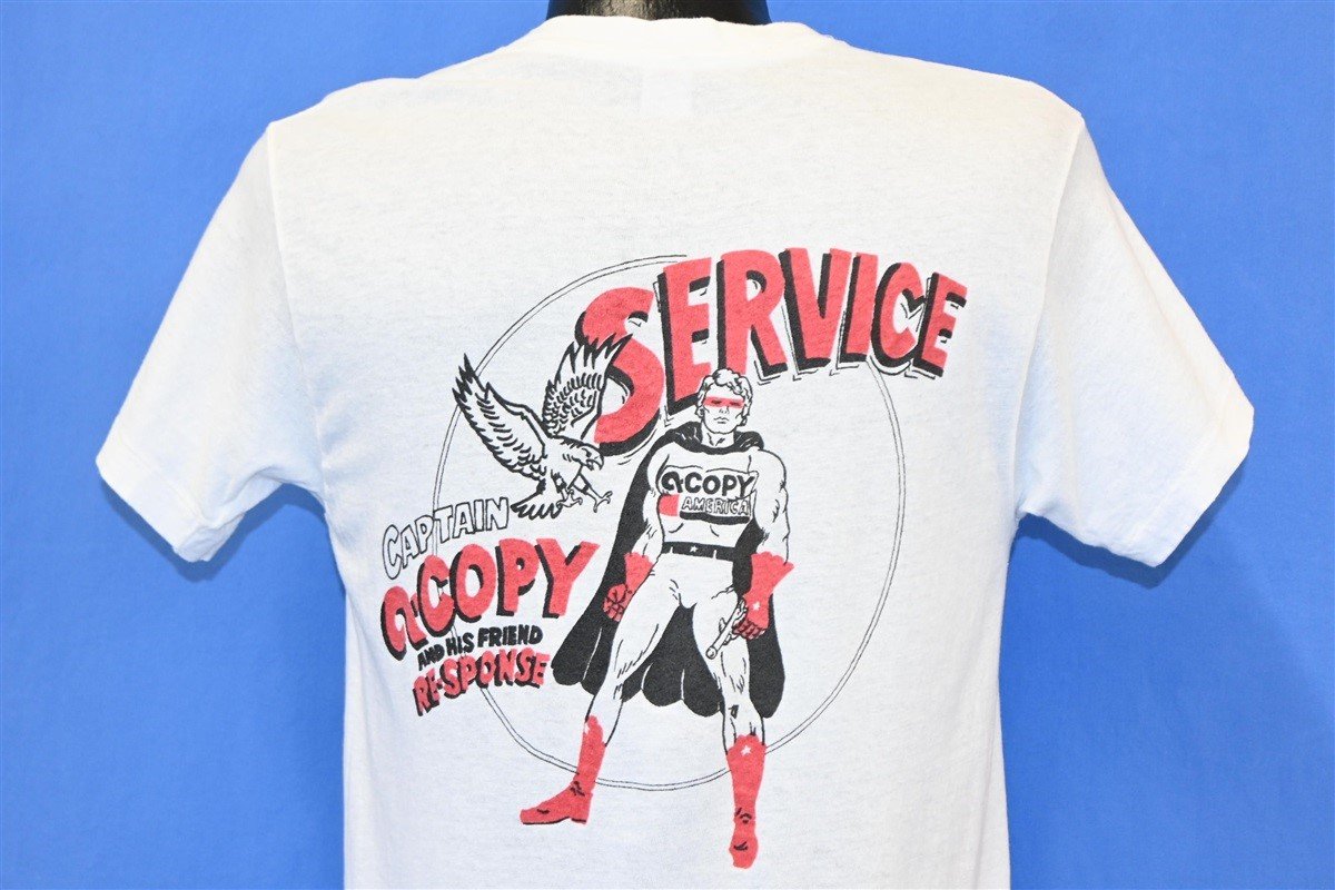 This sweet vintage radio tee is for ROR FM, also known as WROR 98.5. The station was based out of Boston, Massachusetts in the 70s, and the back of this shirt features a unique superhero themed graphic for another Massachusetts based business, A-Copy America. The back graphic shows off Captain A-Copy and his friend Re-Sponse, a humorous duo used to advertise A-Copy. A-Copy America was founded by Herb Chambers, who later became the successful owner of The Herb Chambers Companies automotive dealerships. Chambers founded A-Copy America in 1965, and it eventually became the largest office equipment dealer in the area before it was sold in the 80s.