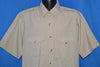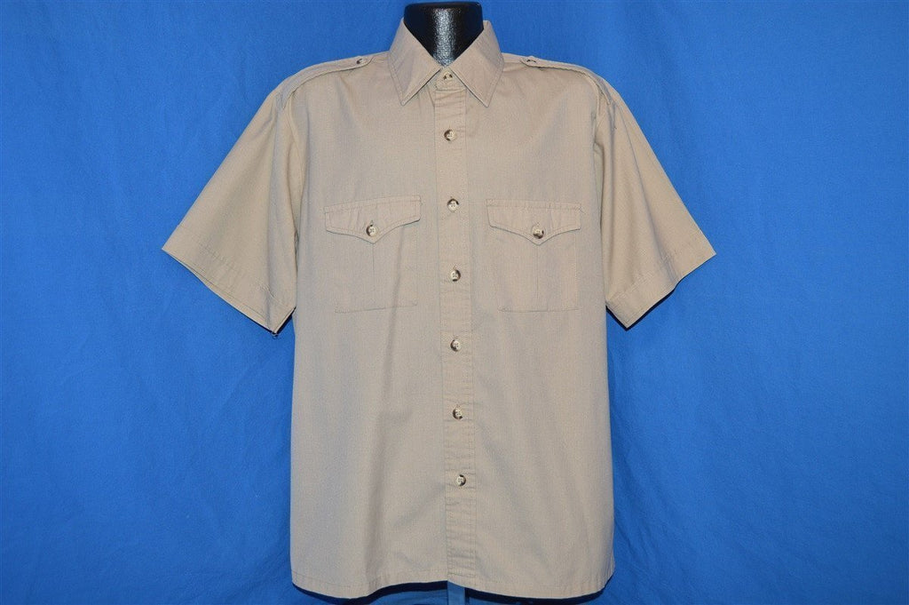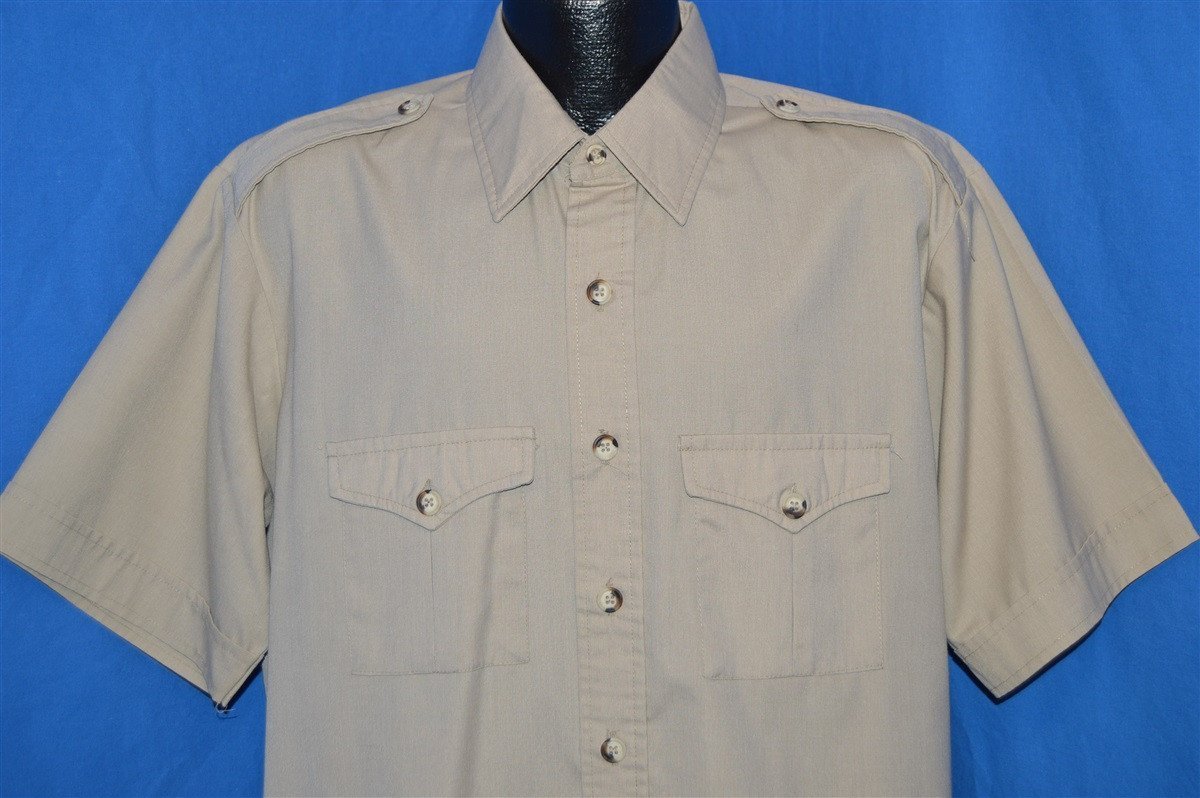 This beige vintage shirt is a short sleeve button down. The shirt has applets on the shoulders.