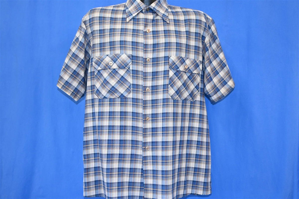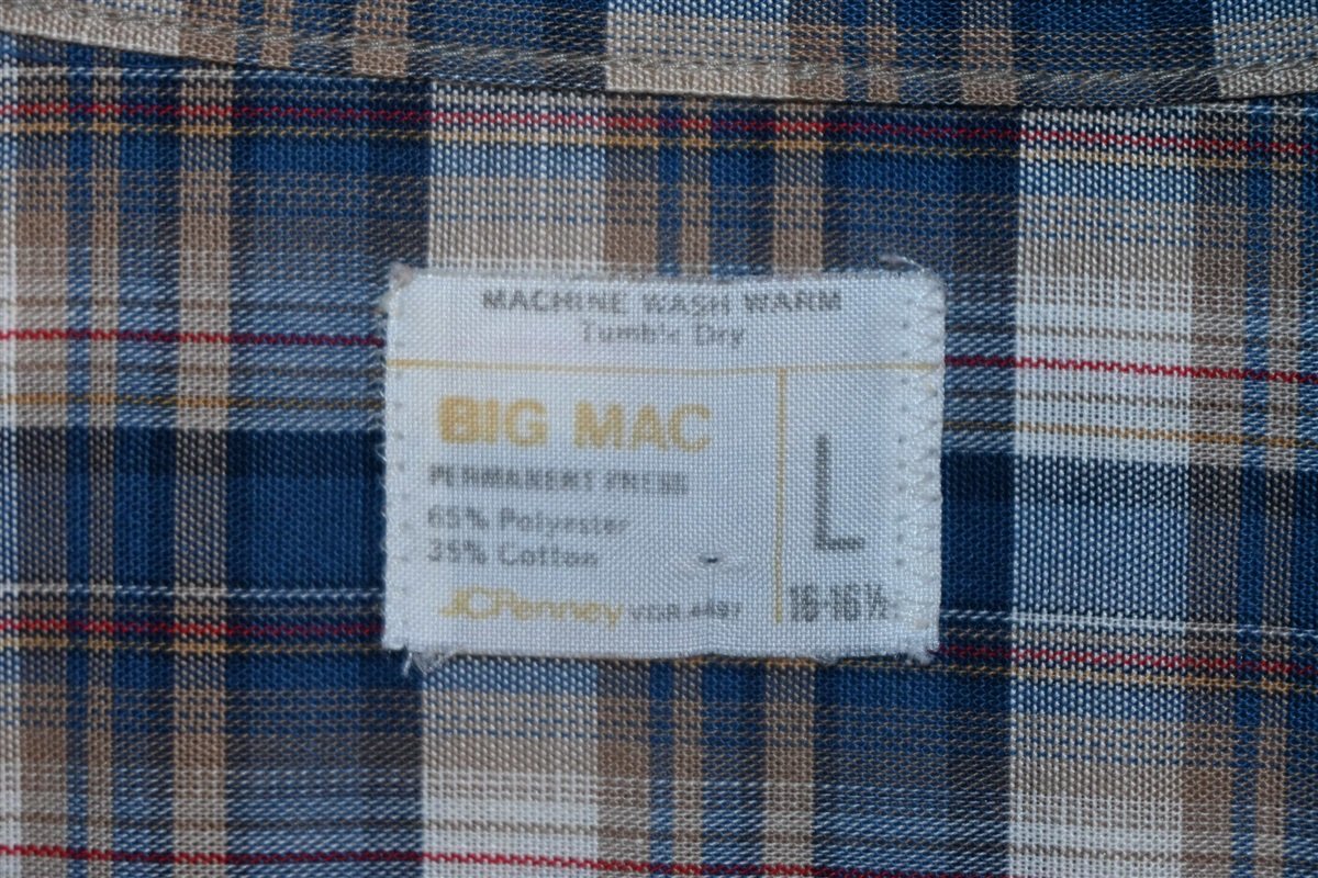This great vintage button down was made by Big Mac, a JCPenny brand, sometime in the 1980s. It comes in an all over plaid pattern in cool shades of blue, cream, and beige with subtle red accenting. It features two flap chest pockets and a square bottom hem. It also has collar stands that help perfect an effortless, put-together look.