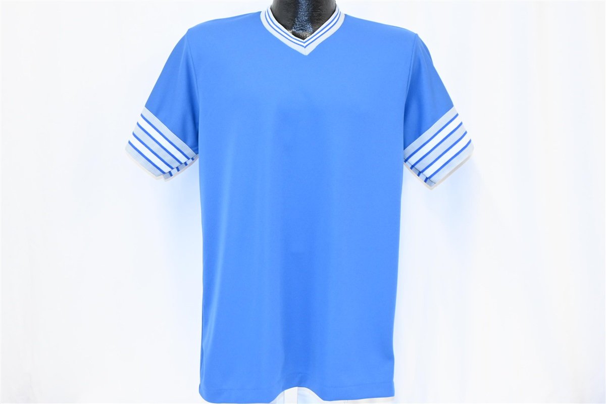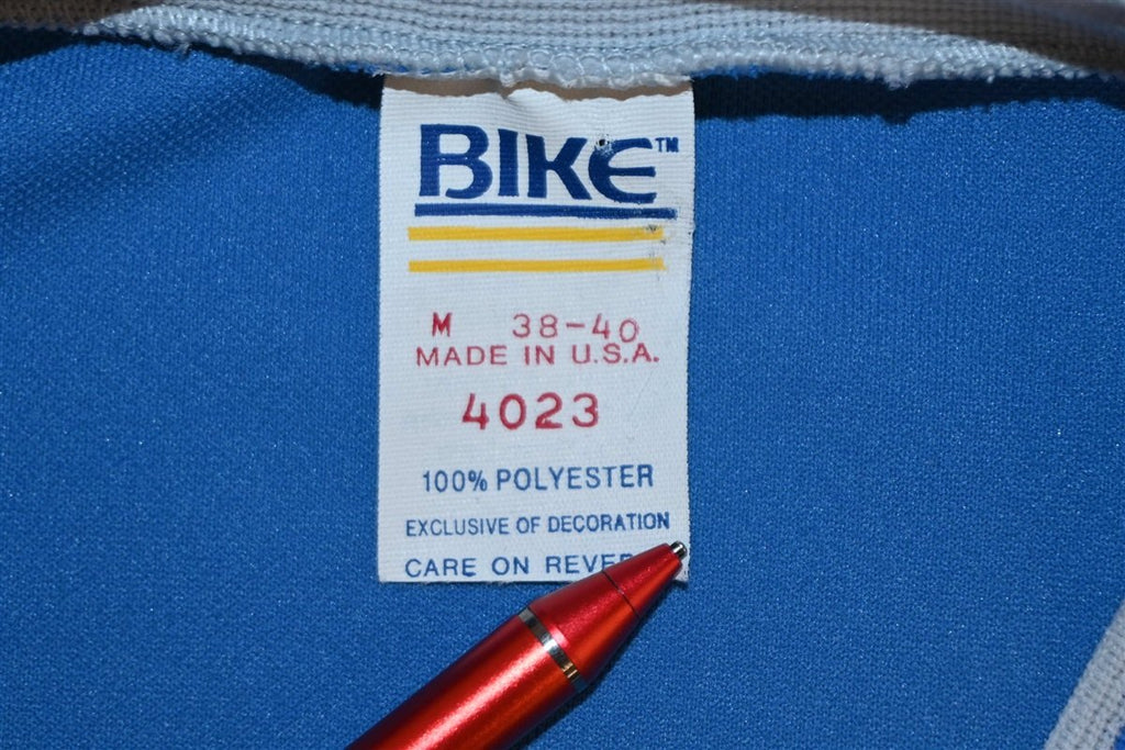 This polyester jersey was made in the 1980s by the Bike Athletic Company headquartered in Atlanta, Georgia. This sportswear manufacturer is credited with inventing the jockstrap back in 1874, with the goal of protecting bicyclists in mind. This jersey is completely blank without any graphics, save for the Bike logo on the sleeve. The shirt has a simple yet stylish look that's accented by a v-neck collar and striped detailing.