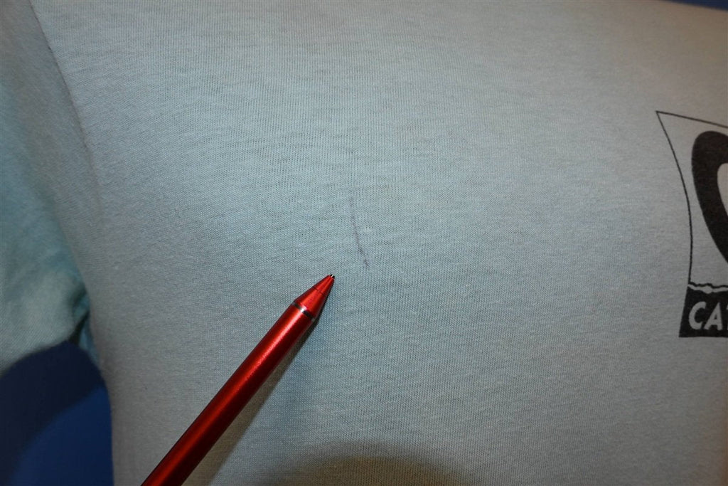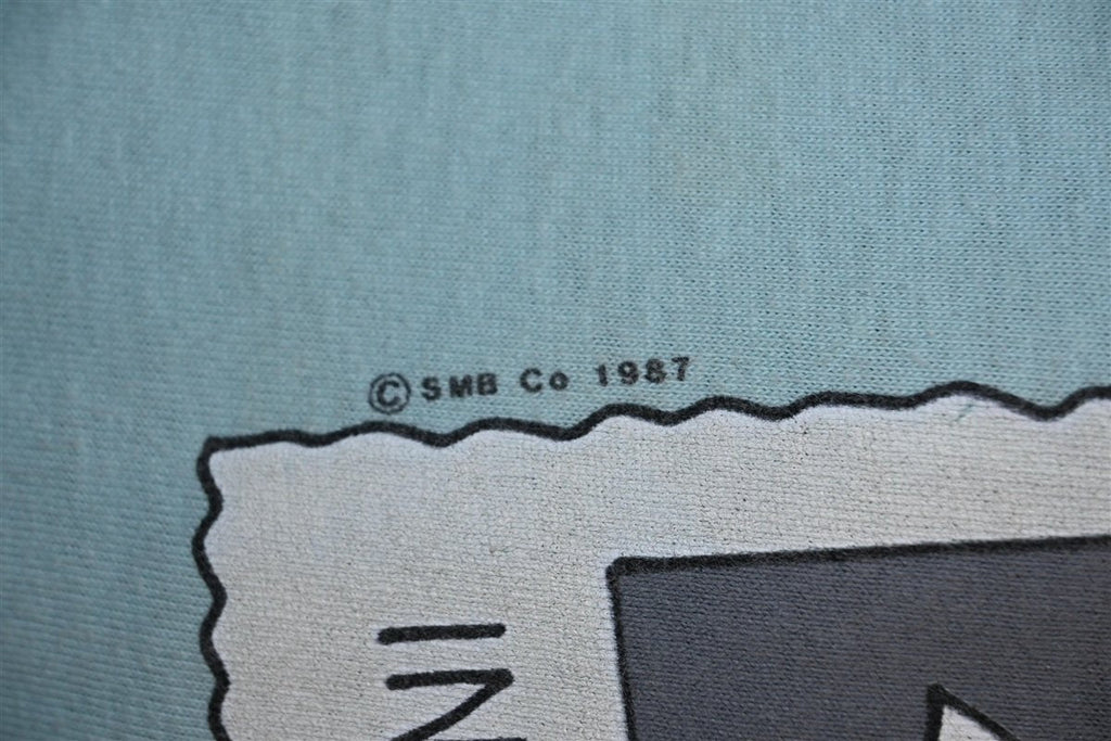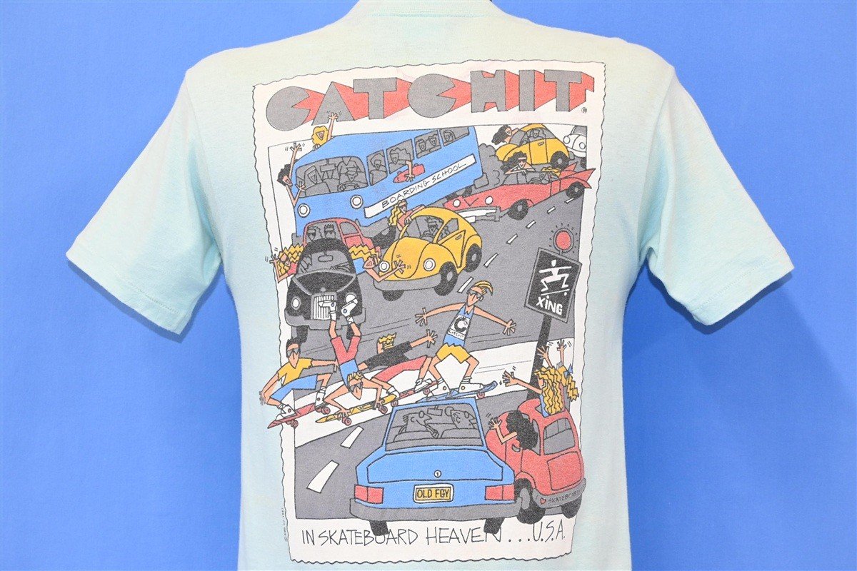 This sweet t-shirt shows off a cartoon of skateboarders crossing the street surrounded by cars and people yelling. The tee says the phrase "In Skateboard Heaven...USA." This shirt is the epitome of the 80s skate and surf culture. The brand Catchit was one of the hippest surf wear companies of the 80s, and centered on the West Coast. Skate culture was blooming into its golden age during this time, and Catchit was jumping in on its rise in popularity.