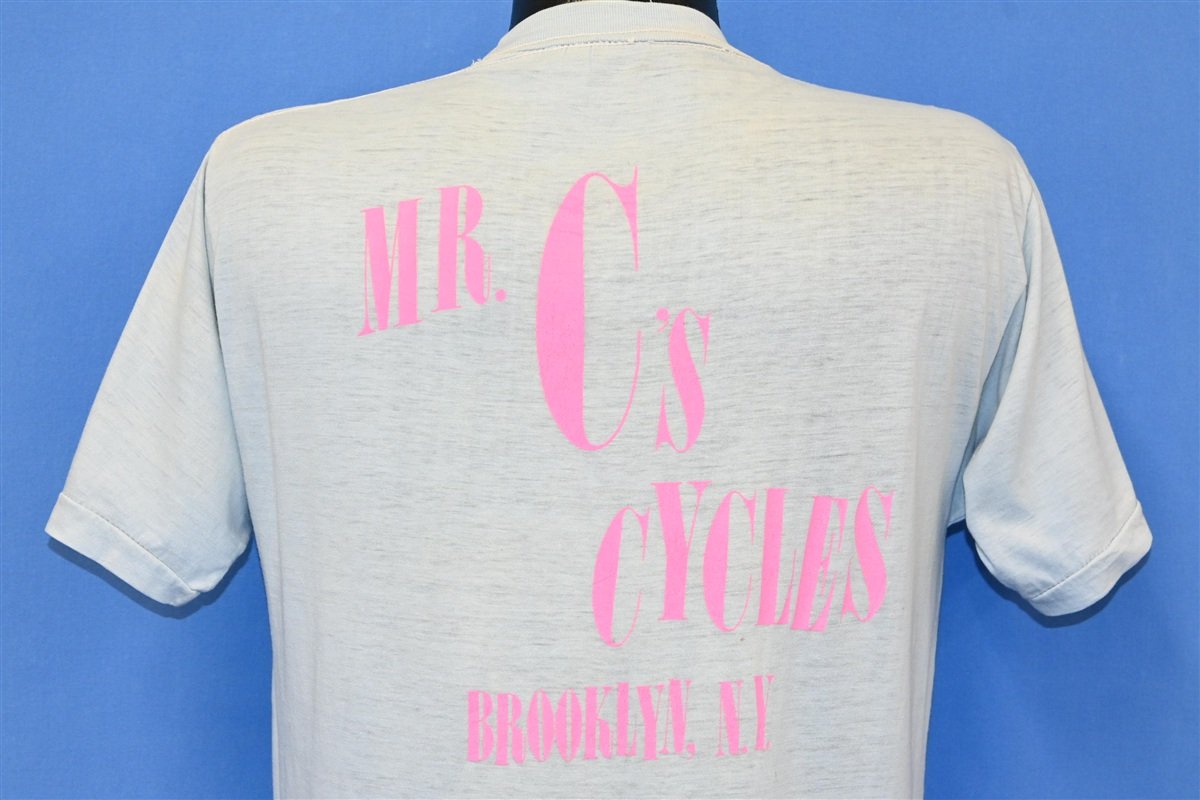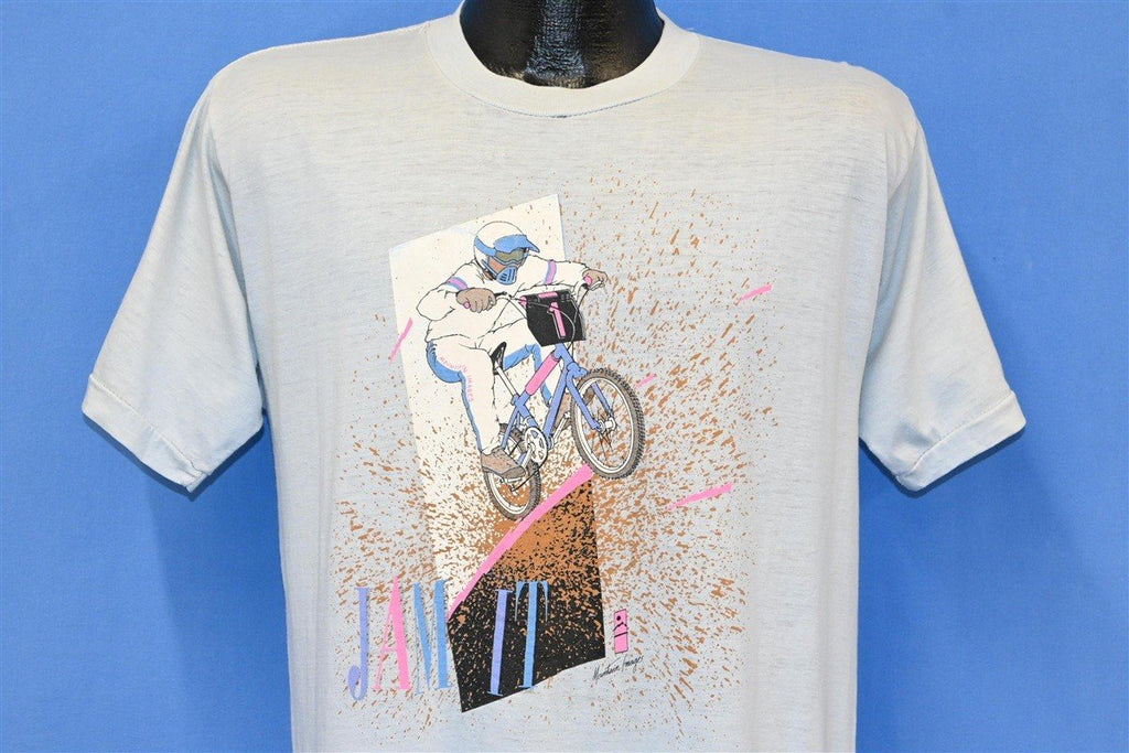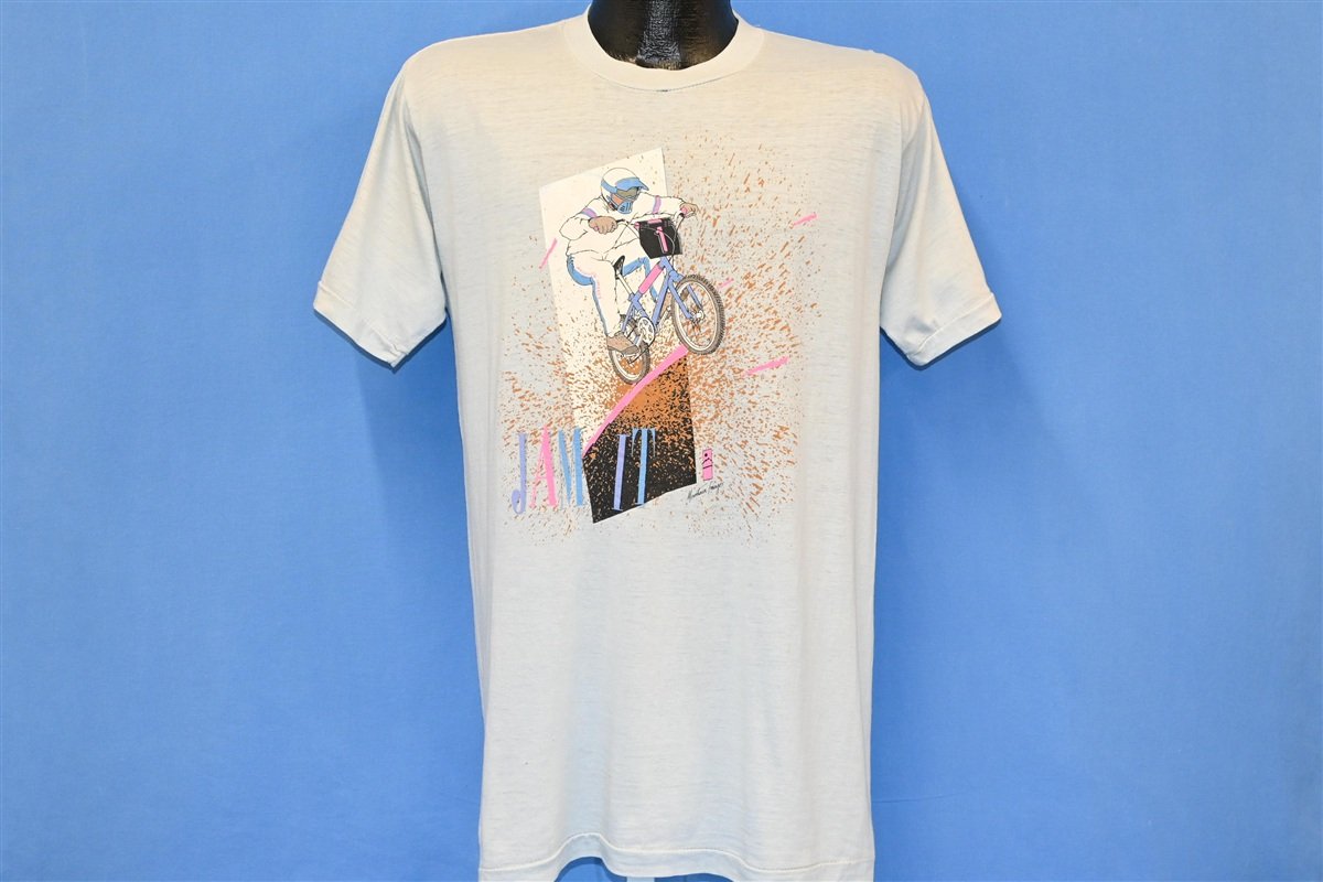 This sweet double sided tee celebrates BMX and has an awesome front graphic with the words, "jam it!" Meanwhile the back advertises a local bike shop in Brooklyn, New York called Mr. C's Cycles. In addition to BMX gear, the shop also has been offering road, mountain, and hybrids bikes for more than thirty years. The two-story shop has long since strived to cater to cyclists of all levels and interests.
