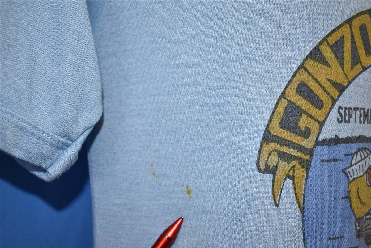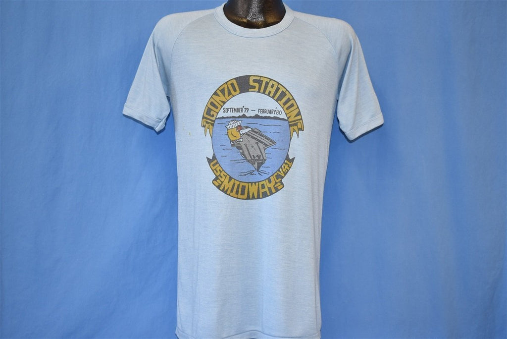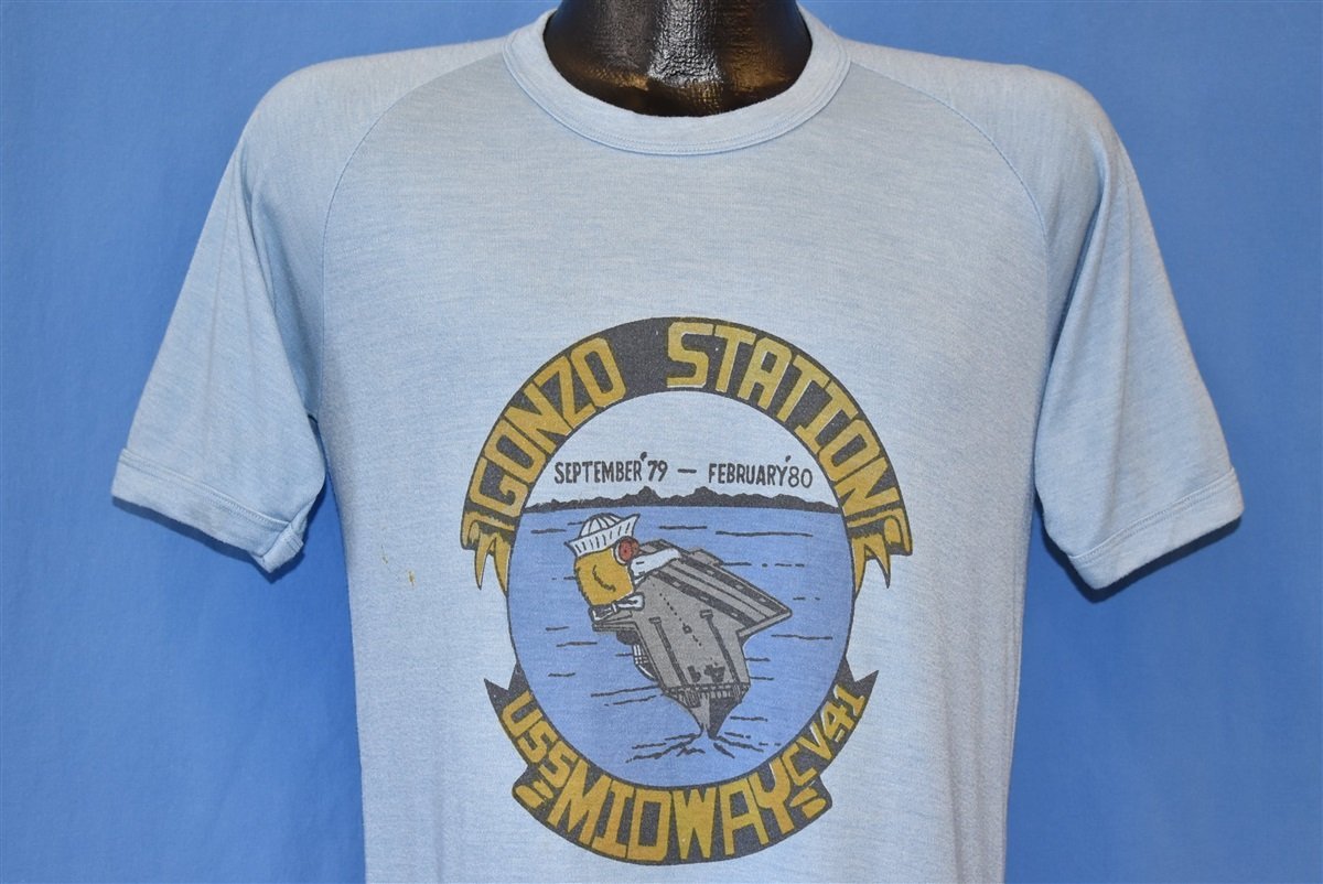 This vintage raglan tee is for Gonzo Station, which is the acronym given to the Gulf of Oman Naval Zone of Operations or Gulf of Oman Northern Zone. The station was a designated area of carrier-based naval operations by the US Navy and US Marine Corps. It was located in the Indian Ocean and used during the Iranian Hostage Crisis from 1979 to 1981. The USS Midway (CV-41) which served initiated the longest at-sea record for any US warship used since World War II, and it was at-sea for 93 days straight. This shirt includes a graphic that somewhat resembles the character featured on the badge for the Station. The character is meant to vaguely resemble the popular Muppets character Gonzo.
