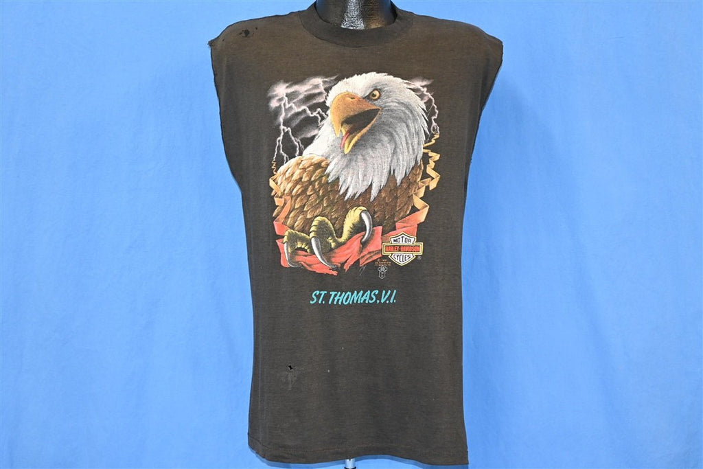 This awesome vintage muscle tank was made back in the 80s to promote Harley-Davidson brand motorcycles. The shirt features a majestic portrait of a bald eagle, the 3D Emblem logo, and the words "St. Thomas, V.I." This shirt could have been a souvenir picked up at a Harley dealership in the Virgin Islands. The Harley-Davidson company is known for having thousands of dealerships and owner clubs scattered throughout the globe, and they are one of the world's largest motorcycle manufacturers.