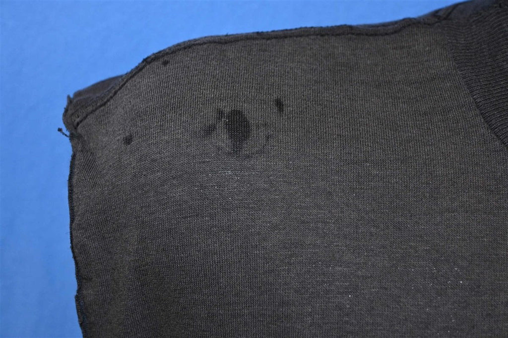Fits like a modern unisex adult large. This shirt is distressed. It is soft and thin with spots, holes, and cut sleeves, see pics.