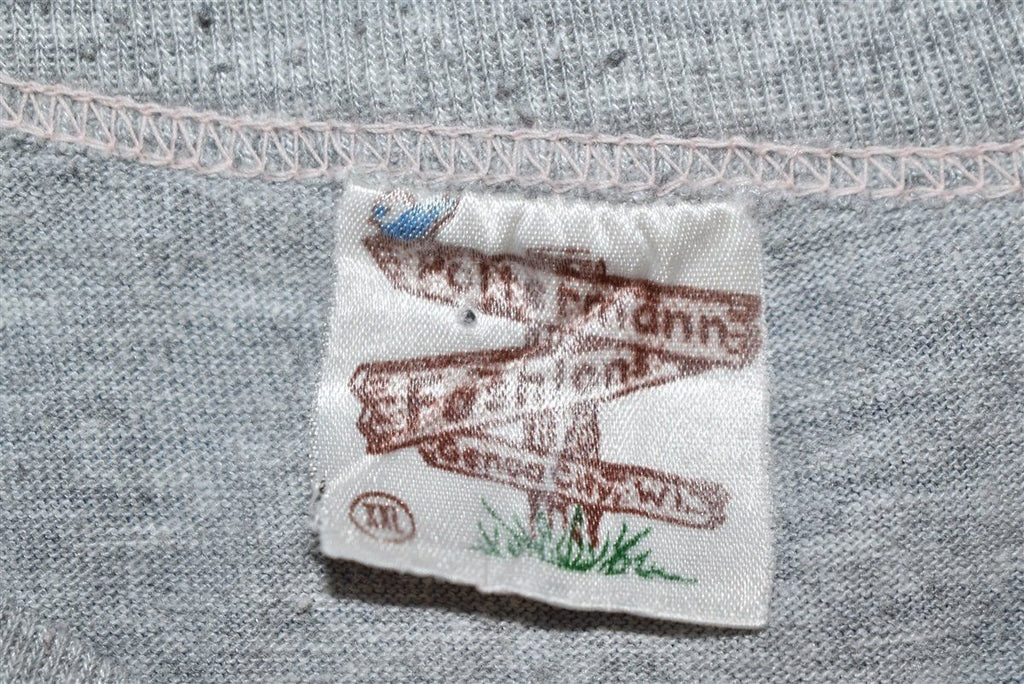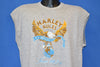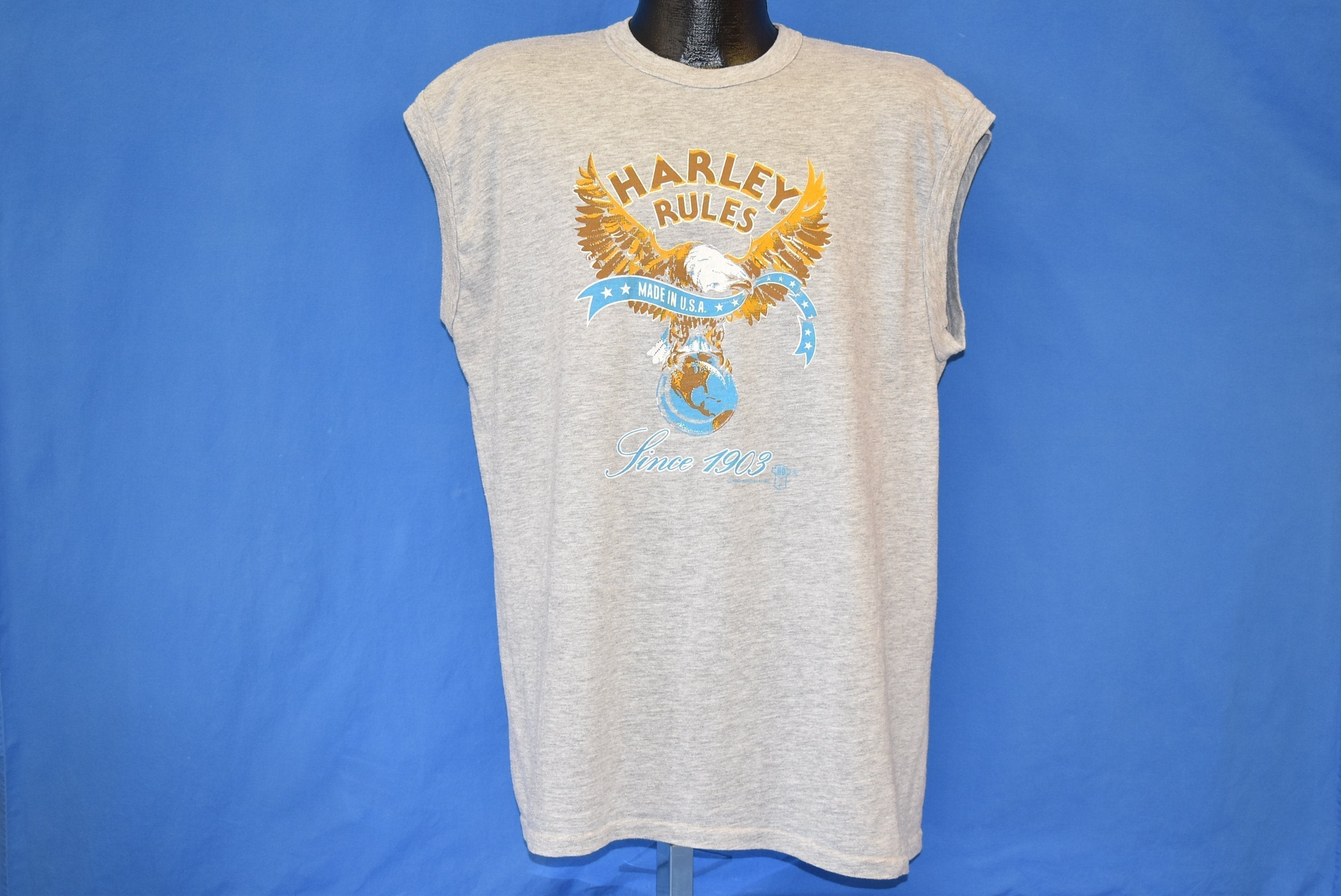 This sleeveless t-shirt is from Harley Davidson in the 1980s. It has a graphic of an eagle perched on a globe on the front with the text "Harley Rules, Made in U.S.A., Since 1903".