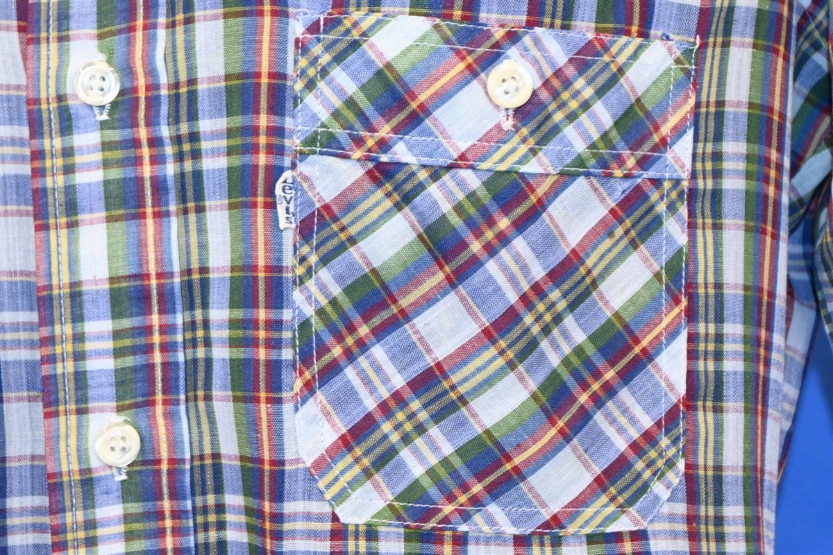 This awesome shirt was made by the Levi's apparel company in the 80s. The shirt is decked out in a plaid pattern featuring rich shades of blue, green, and red. It also has button front closures, two buttoned chest pockets, and the signature Levi's white tab tag.
