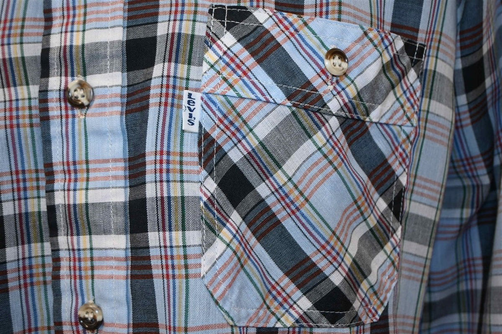 This vintage button down was made by the classic apparel brand Levi's and it features their white tab tag. The shirt is decked out in a plaid pattern featuring shades of blue, red, yellow, and green. The shirt also has two buttoned chest pockets and a nice tapered fit.