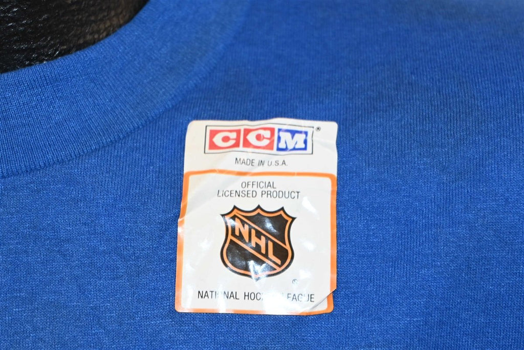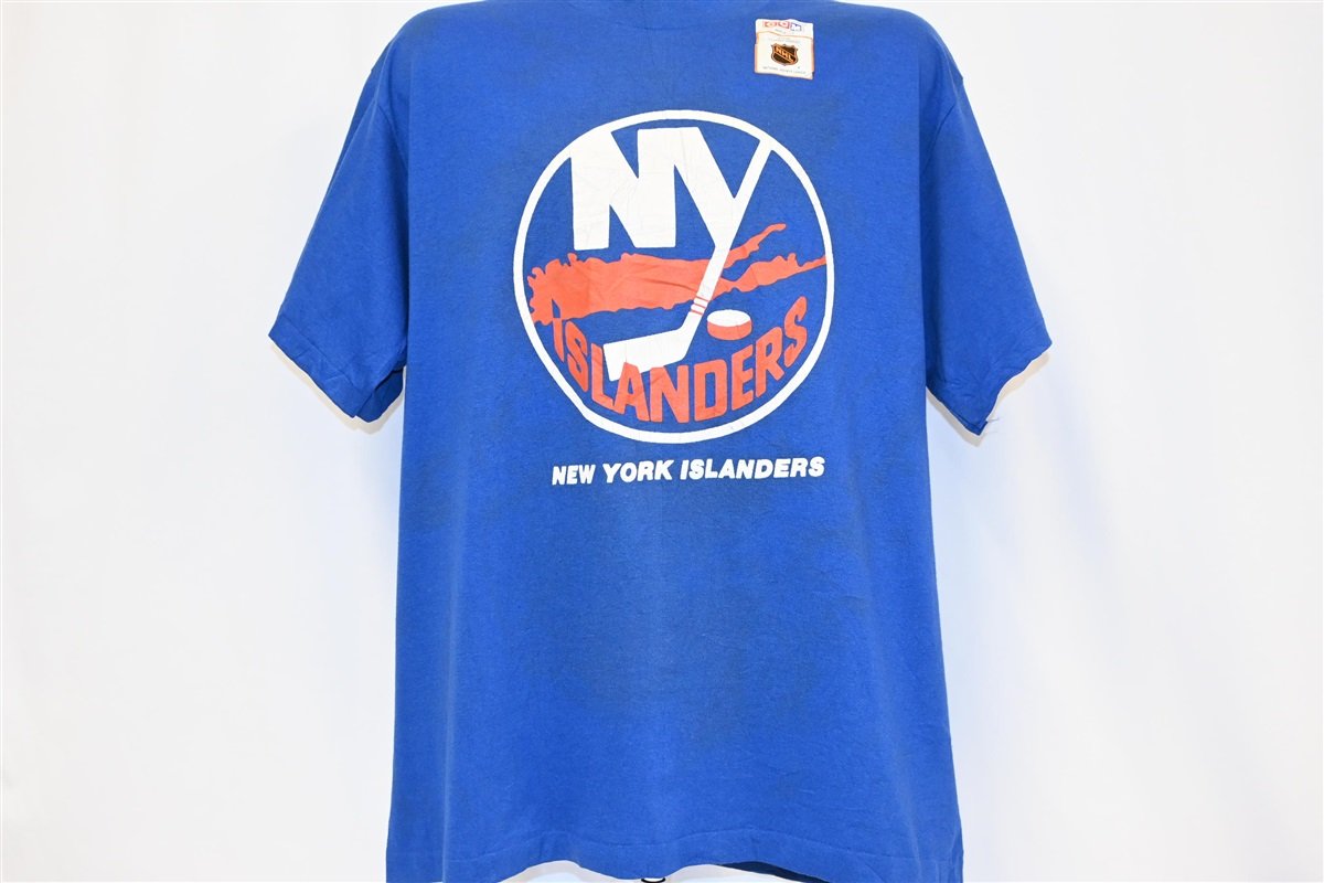 This cool vintage hockey tee reps the professional team the New York Islanders. This shirt was made in the 80s, a decade in which the team won four consecutive Stanley Cup championships. This period also saw the team win an unparalleled, 19 consecutive playoff series games. Some notable team members during this era included Billy Smith, John Tonelli, and Mike Bossy.