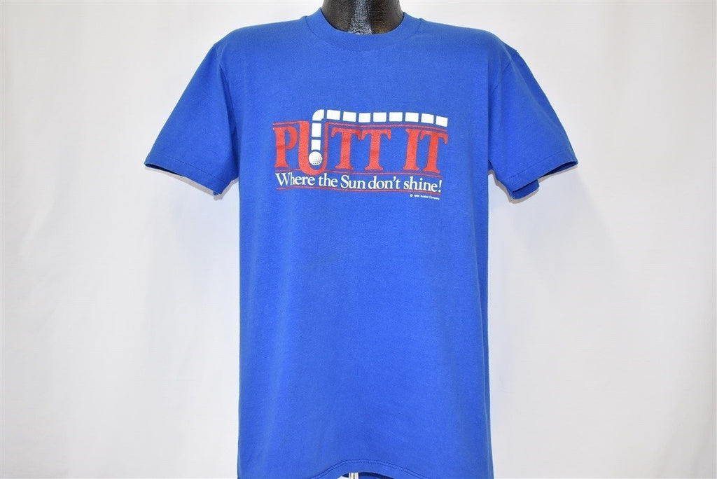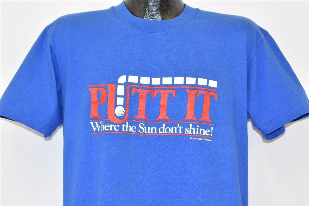 This funny vintage golf tee bears the phrase, "Putt it where the Sun don't shine!" The colloquial phrase has been altered into a golf pun for this shirt. The graphic shows the path of a golf ball entering a hole.