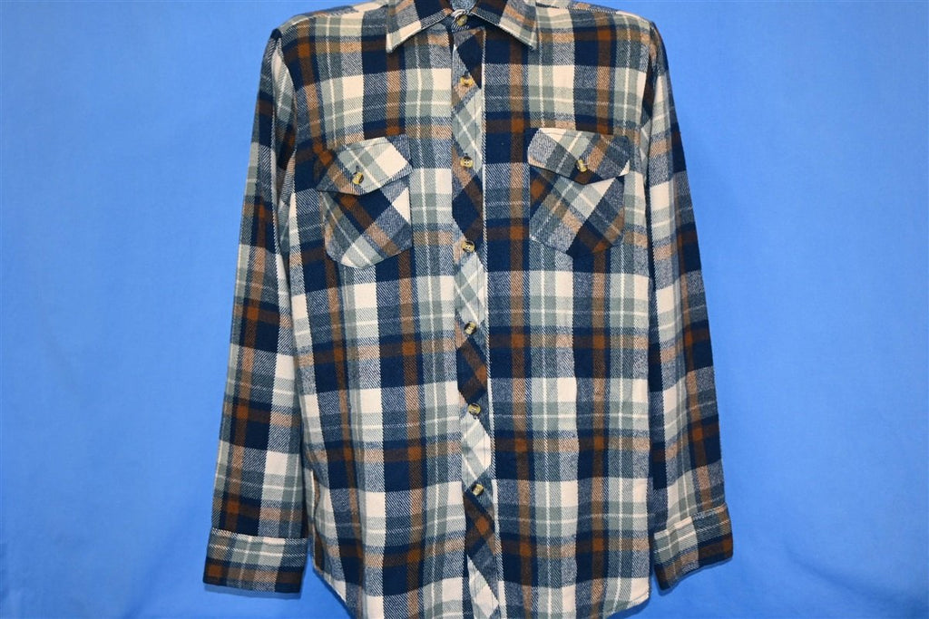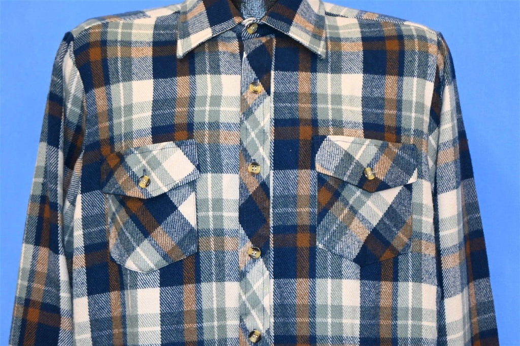 80s Sears Blue Brown Plaid Flannel Button Down Shirt Large