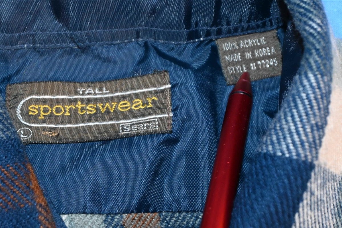 This cozy vintage flannel was made by Sears in the 80s. This shirt features a super soft acrylic material and a handsome brown and blue plaid pattern. The shirt also has two button flapped chest pockets on the front.