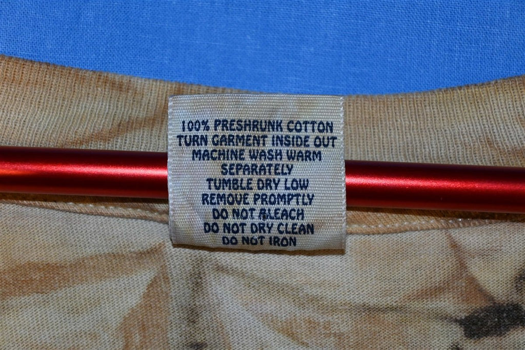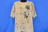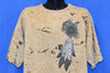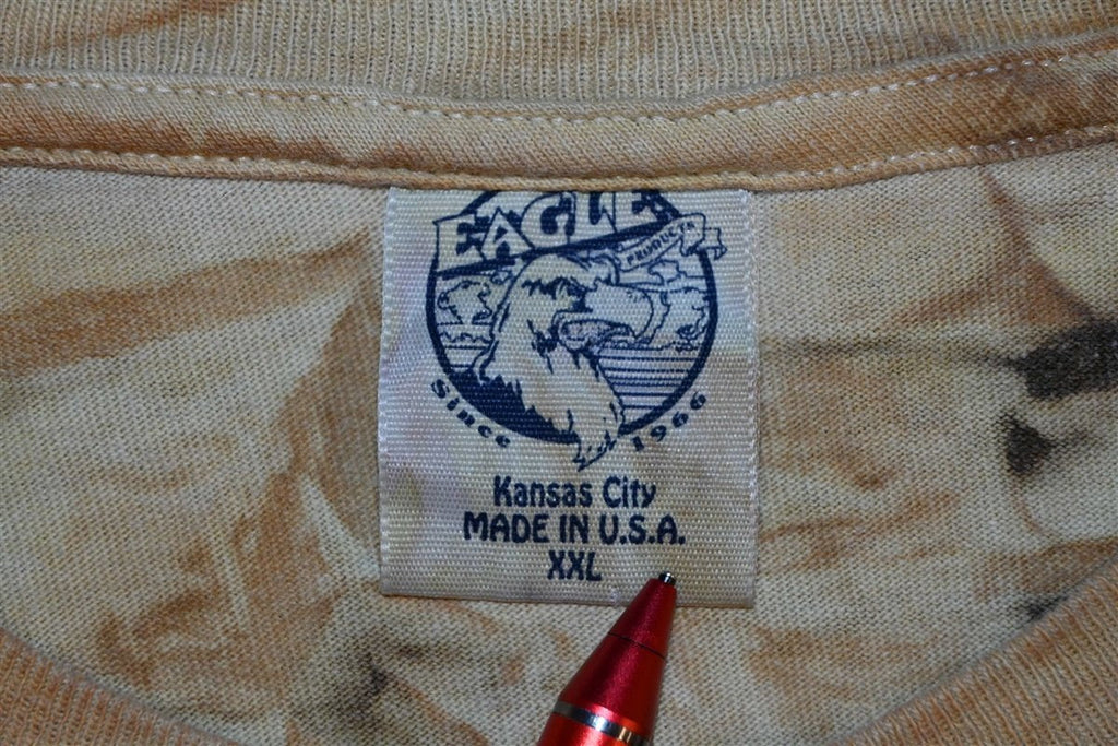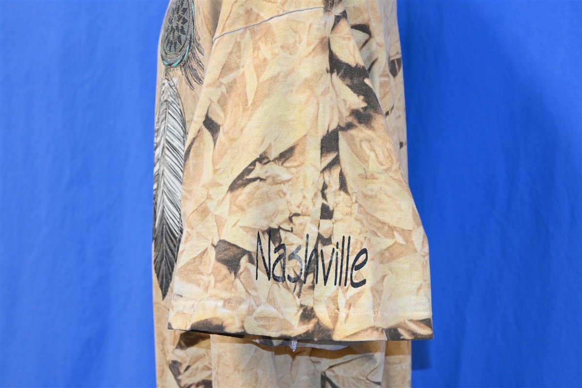 This cool shirt has a beige all over print that looks like it was made using a crumple tie dye technique. The shirt features a graphic of a bald eagle and a dream catcher, and it also has a graphic on the sleeve indicating that the shirt is a souvenir from Nashville, Tennessee. Dream catchers are used by several Native American cultures. They are handcrafted items that are hung near a bed or cradle in order to ward off nightmares, and they're particularly used to protect the dreams of young children. Nashville has a rich Native American history, with some of the more prominent tribes being the Cherokee and Chickasaw.