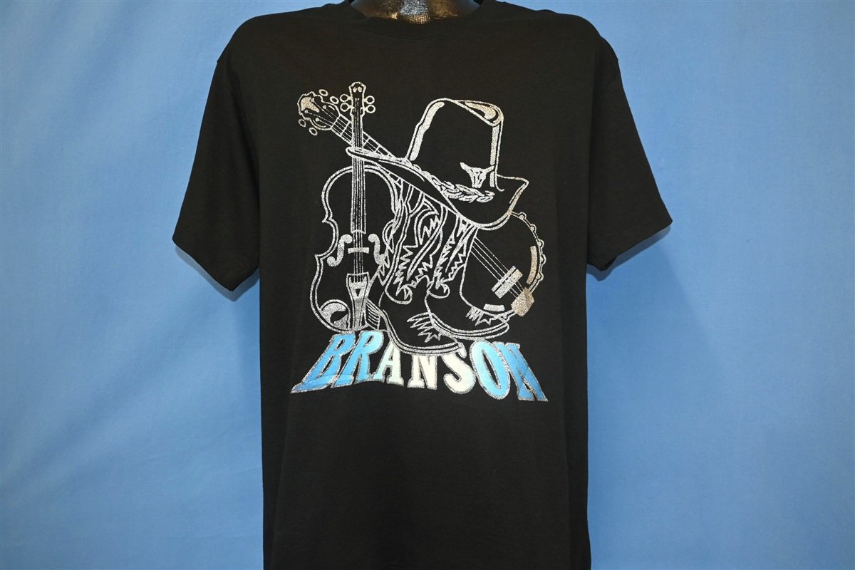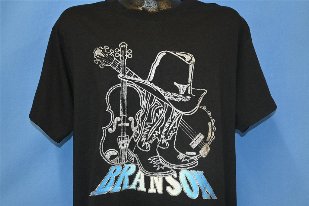 This vintage tee pays tribute to the city of Branson, Missouri and it features a spectacularly glittery design, showing off a fiddle, a banjo, and some cowboy gear. This shirt celebrates Branson's thriving country music scene. The city's 76 Country Boulevard is famous for its large collection of theaters and performance venues. Branson is also just a short distance away from the Gilded Age theme park Silver Dollar City, which is also known for its live entertainment.