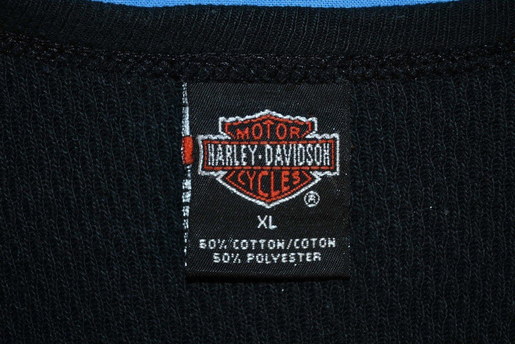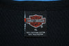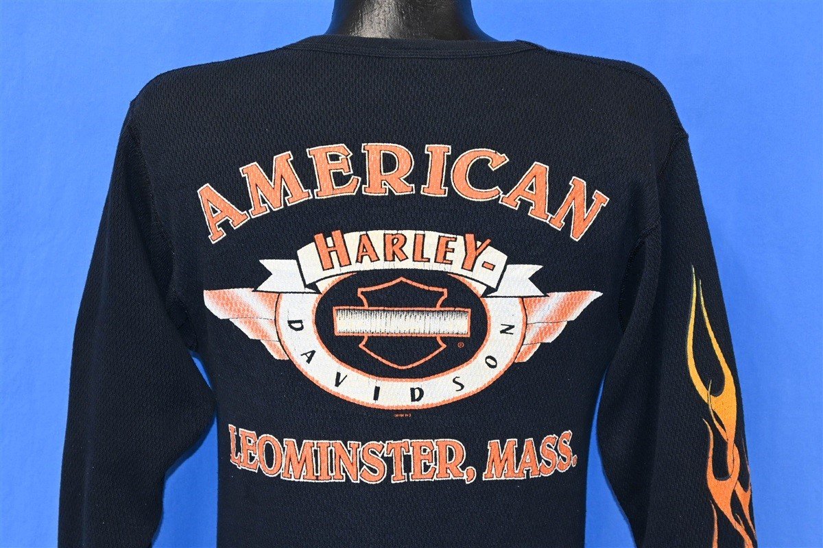 This awesome waffle knit tee is for American Harley-Davidson, a motorcycle dealership in Leominster, Massachusetts. This family owned dealership opened over 45 years ago and, as of 2022, was still going strong. Like many dealerships, American Harley sponsors a Harley Owner's Group, or HOG, club. The Leominster Chapter hosts all kinds of events, including charity rides, BBQs, and movie nights.