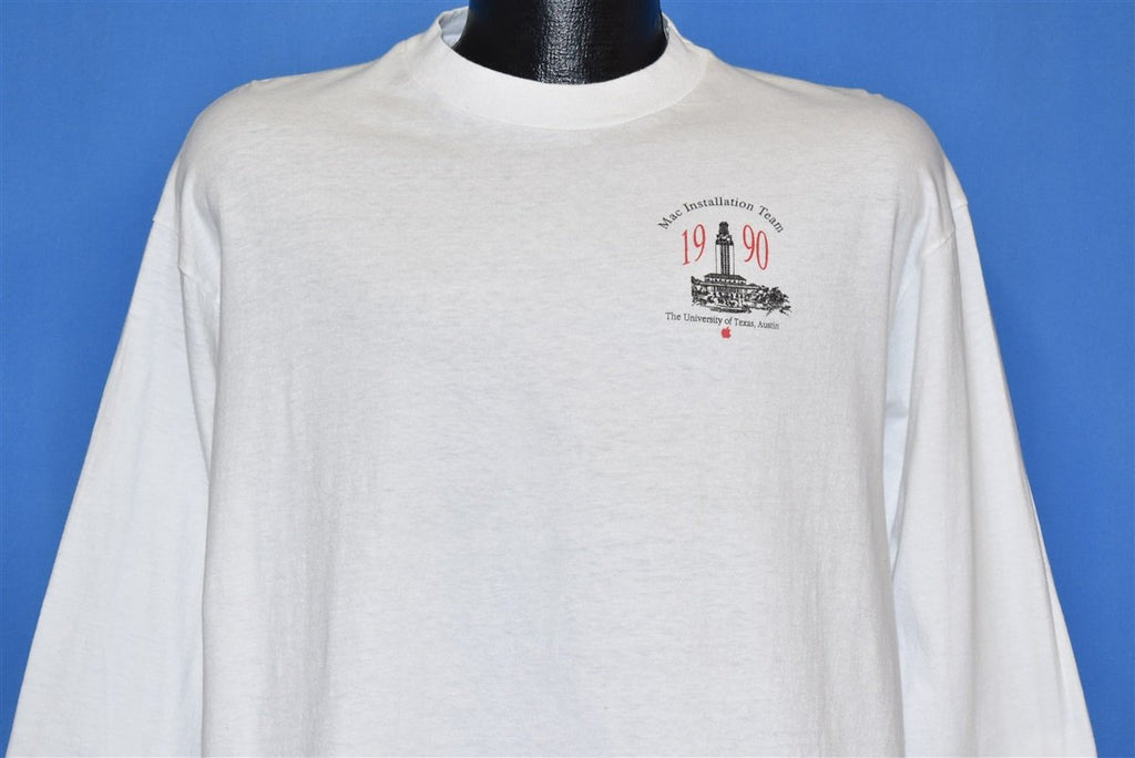 The tee was probably custom made for the Mac Installation Team, probably a group of tech guys enlisted to set up the newly released Macintosh Classic personal computer across college campuses. Apple released the affordable PC in October of 1990 and had been marketing towards college kids leading up to the launch. This Mac Installation Team survived the Mac Invasion at University of Texas, Austin.