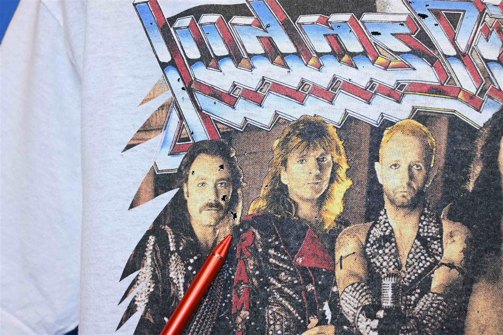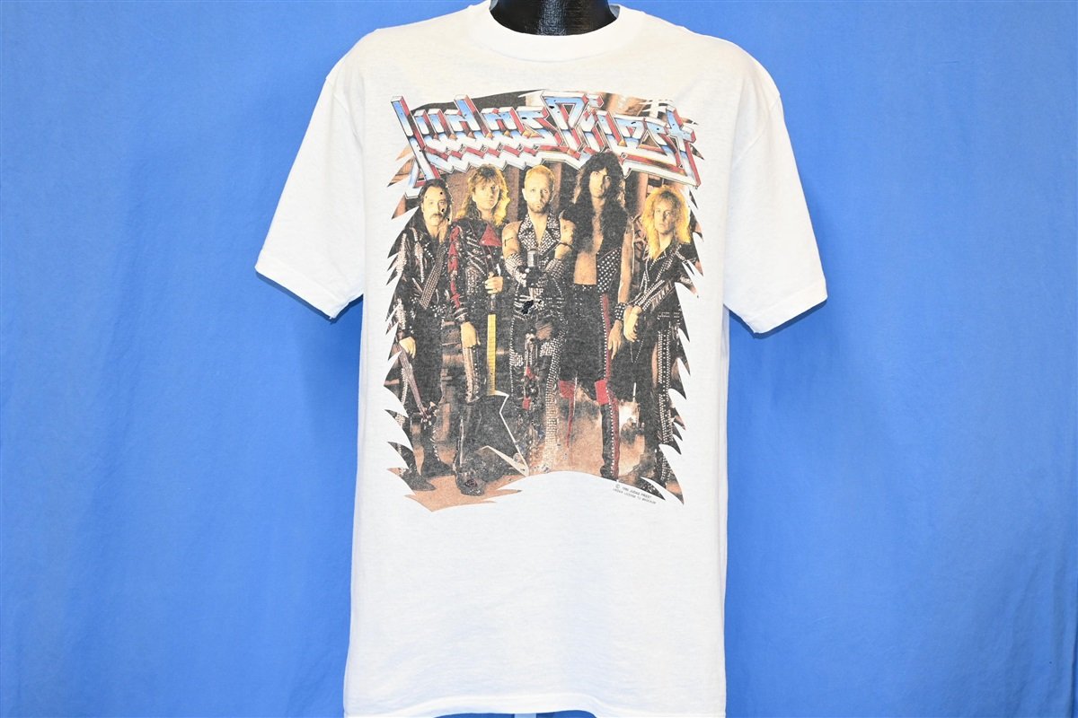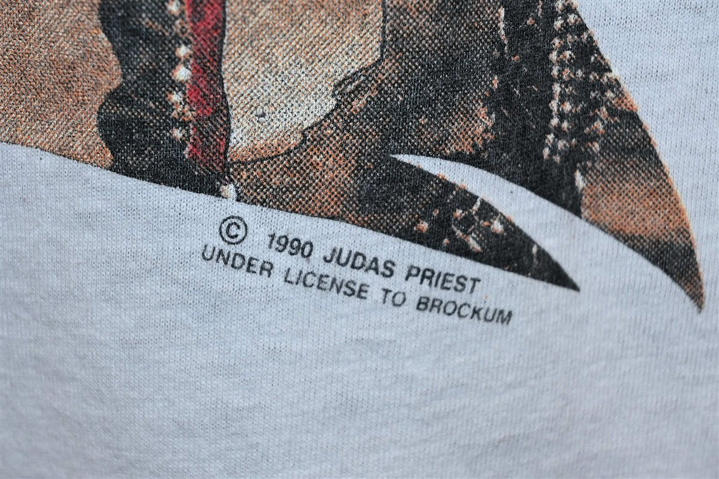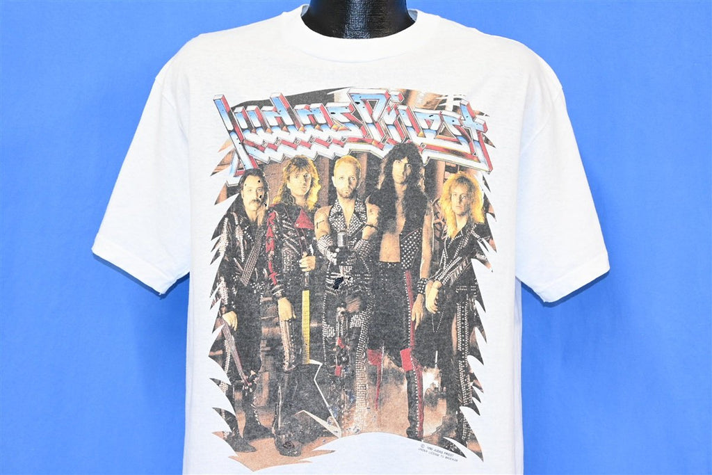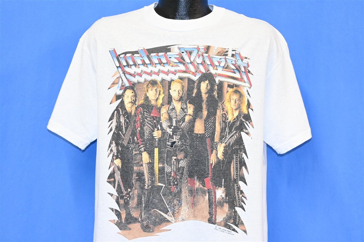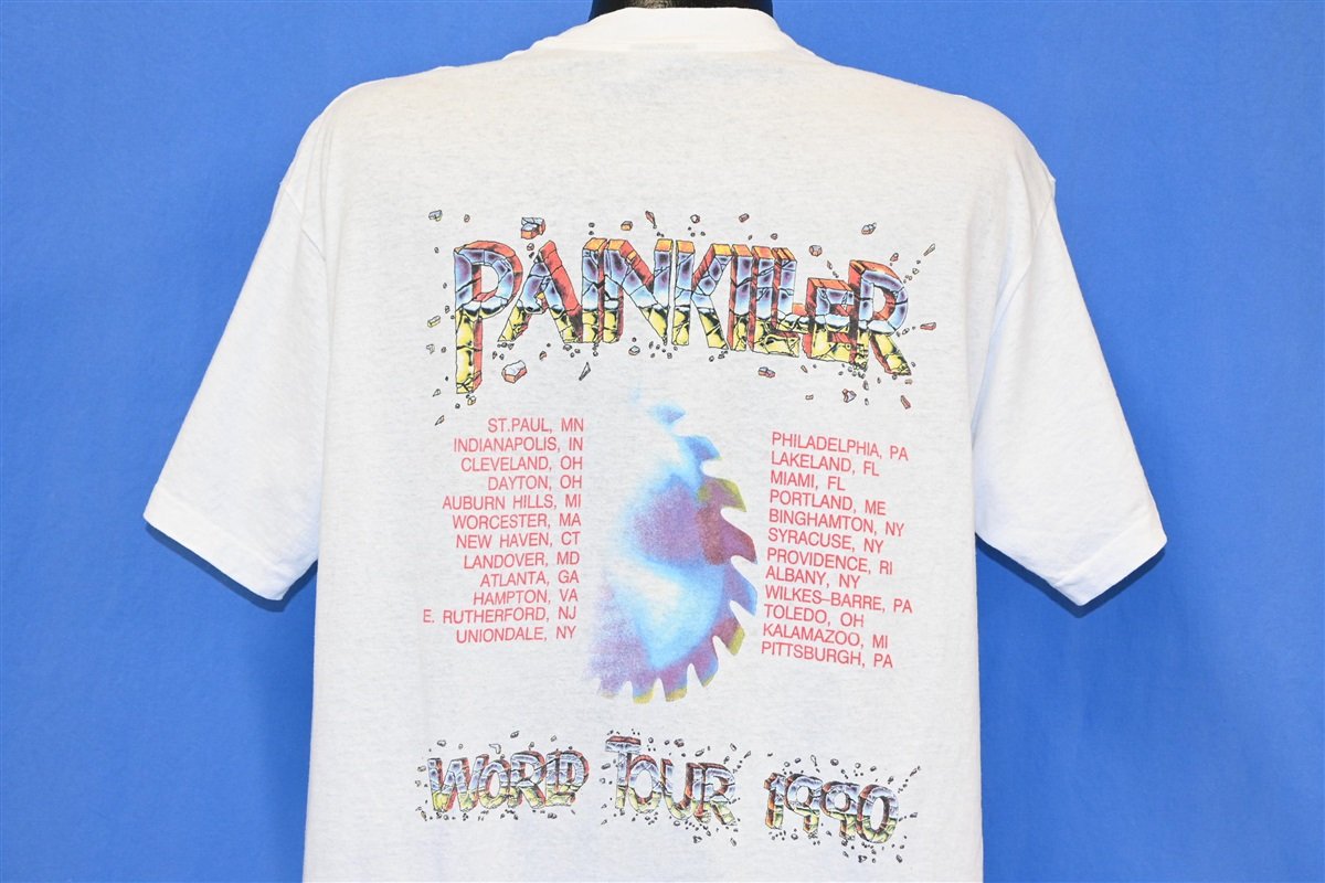 This awesome vintage concert tee is for the band Judas Priest from the Painkiller World Tour back in 1990. Painkiller was the last album to feature long-time lead vocalist Rob Halford, until his eventual return in 2005 on the album Angel of Retribution. It was also the first release to include the band's new drummer Scott Travis.
